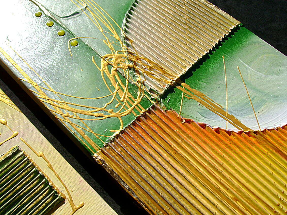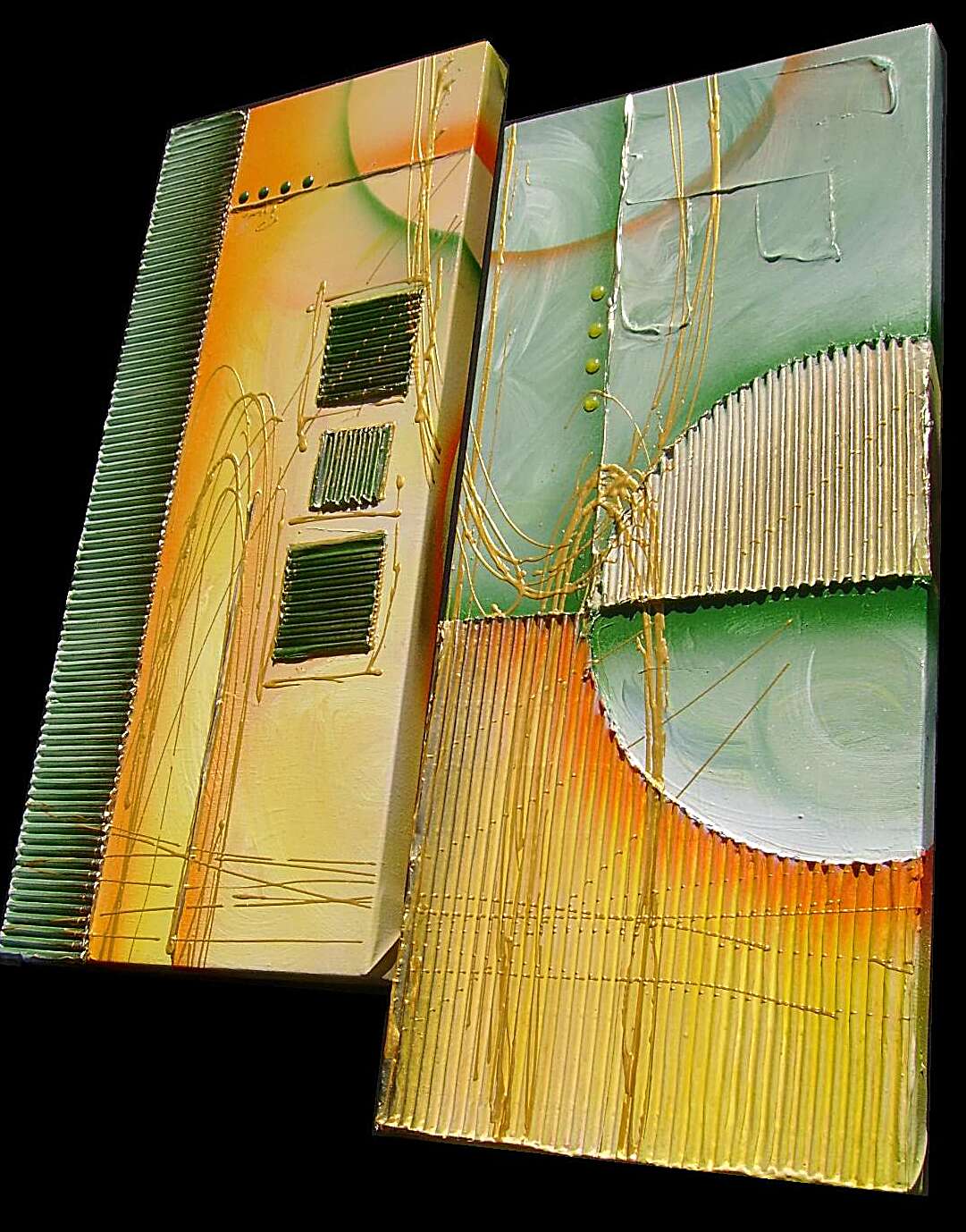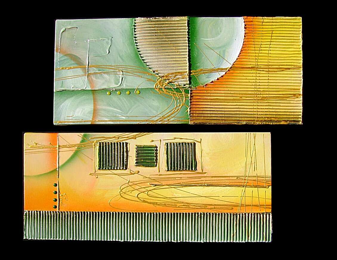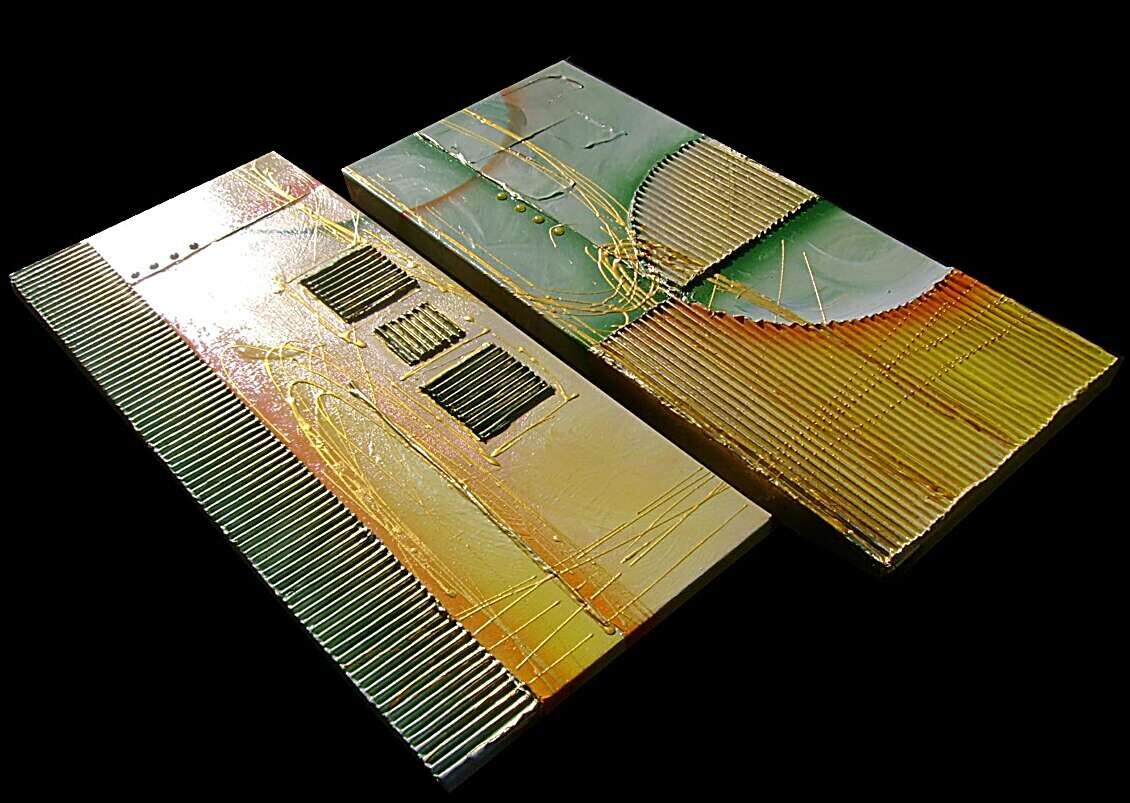 Opera realizzata in tecnica mista ,mediante l'utilizzo di colori acrilici , olii e metallici , paste acriliche , inserti. L'opera , e' composta da 2 tele 30 x 70 x 4 cm . Il prezzo di vendita e' di 220 ,00 euro+spsp
