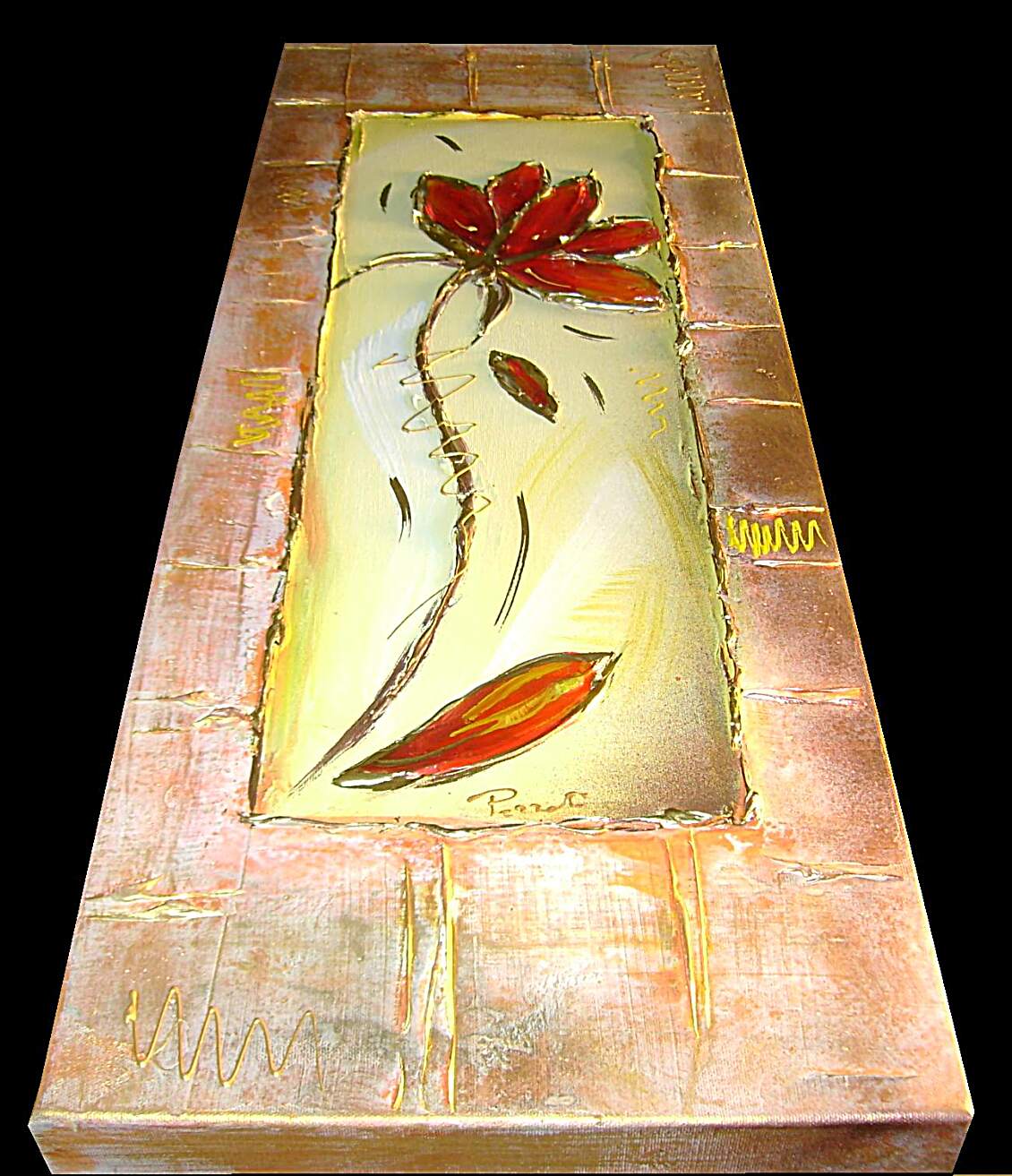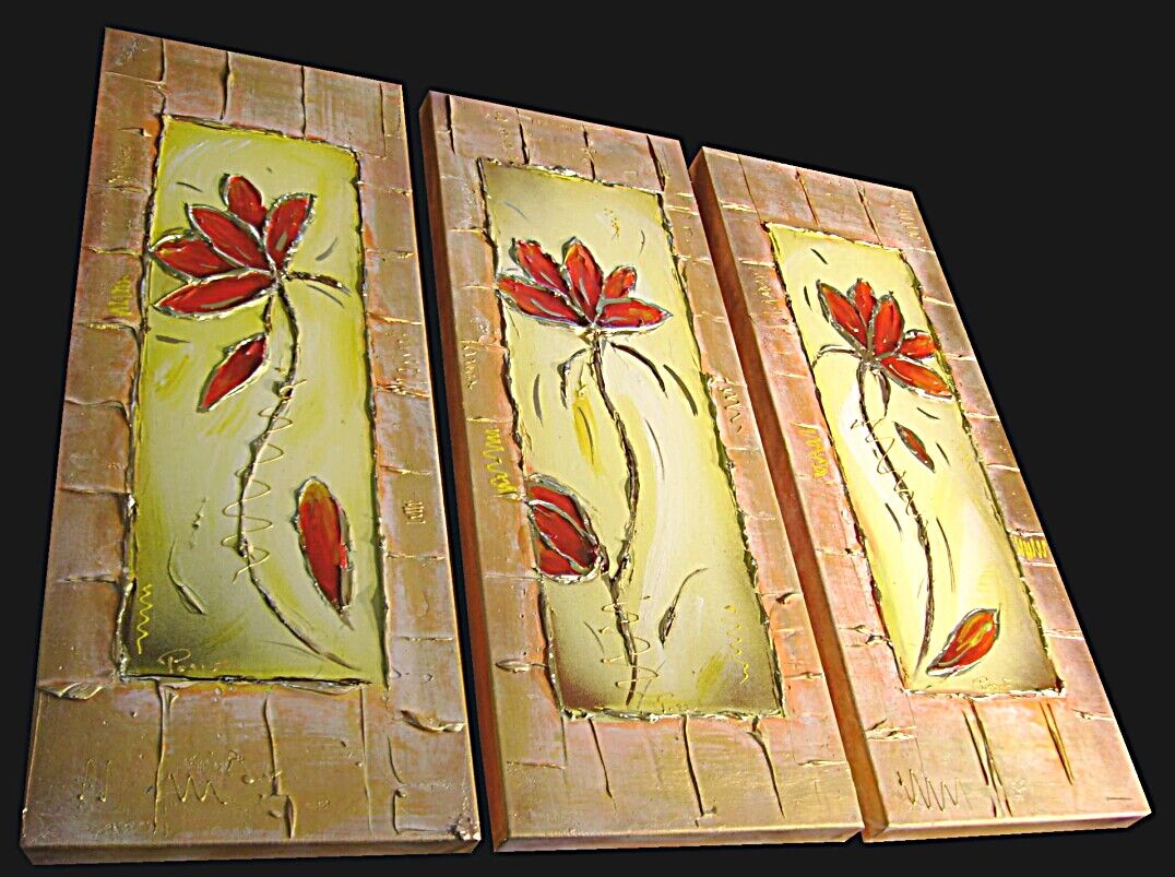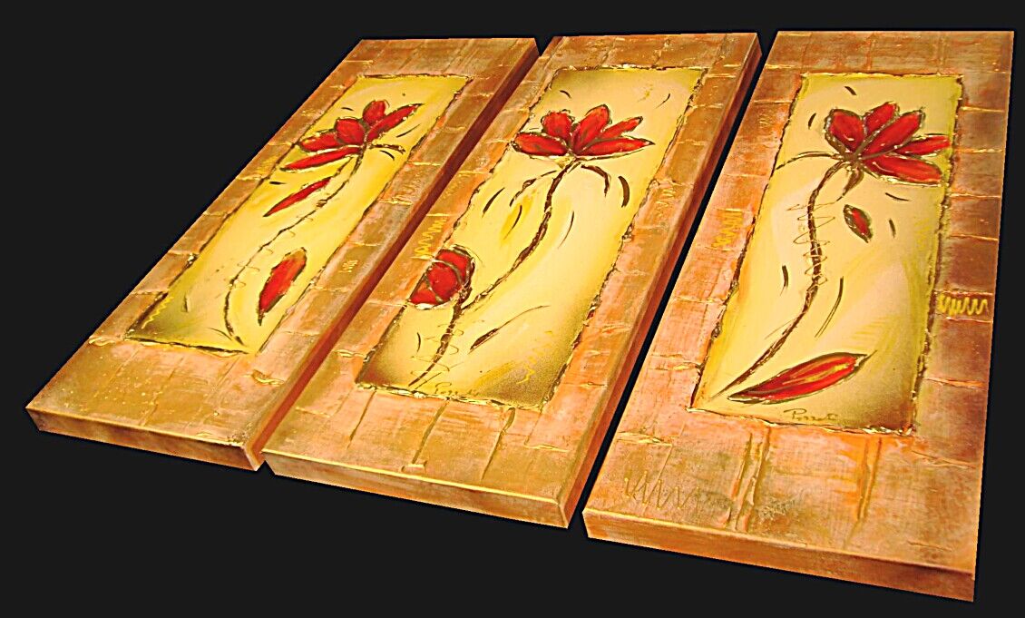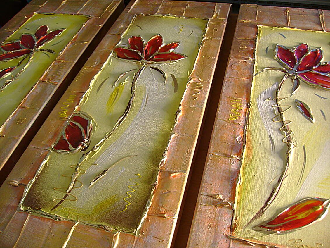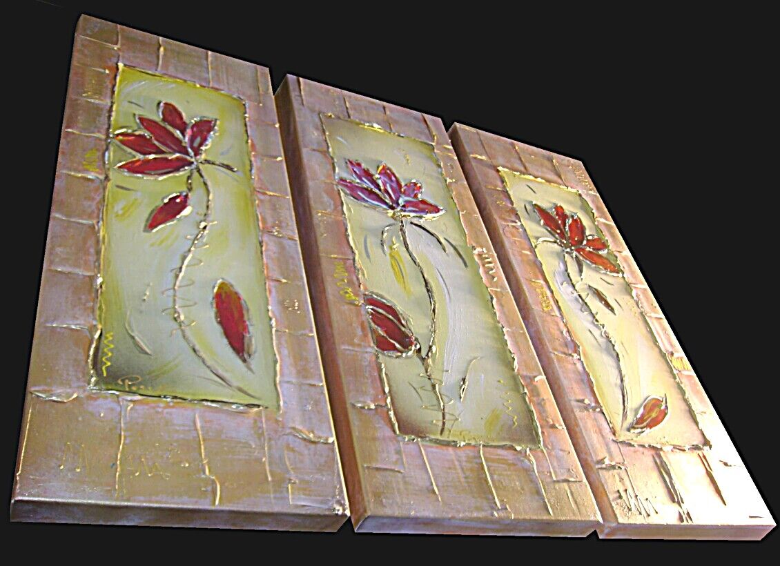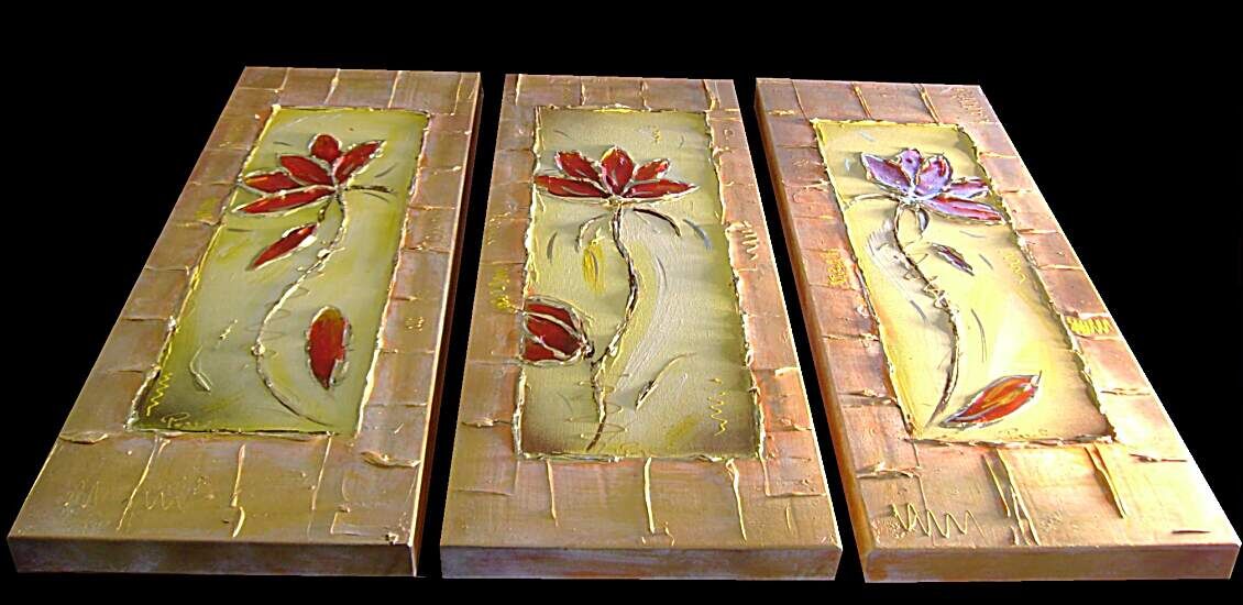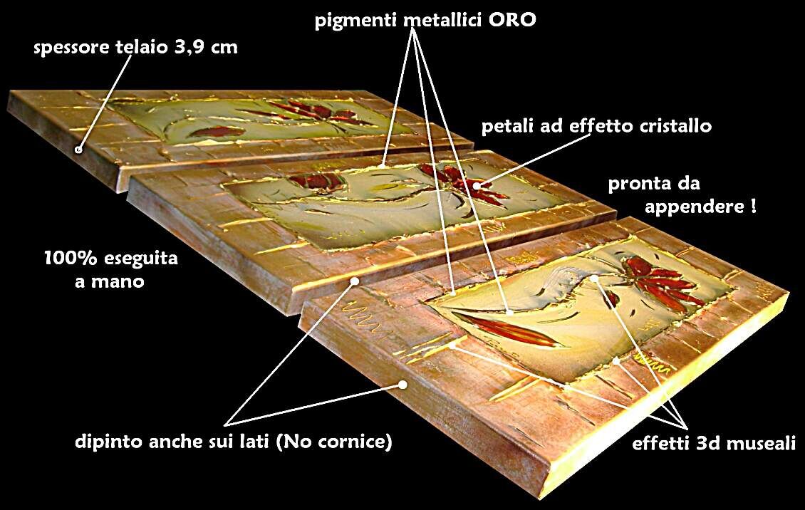Opera museale realizzata in tecnica mista TRIDIMENSIONALE , mediante utilizzo di colori acrilici , pigmenti metallici , colori ad olio , resine epossidiche effetto cristallo ,paste acriliche , limatura metallica , sabbie di fiume . L'opera e' composta 3 TELE 30 X 80 X 4 CM ca. Il prezzo di vendita e' di 210 ,00 euro+spsp