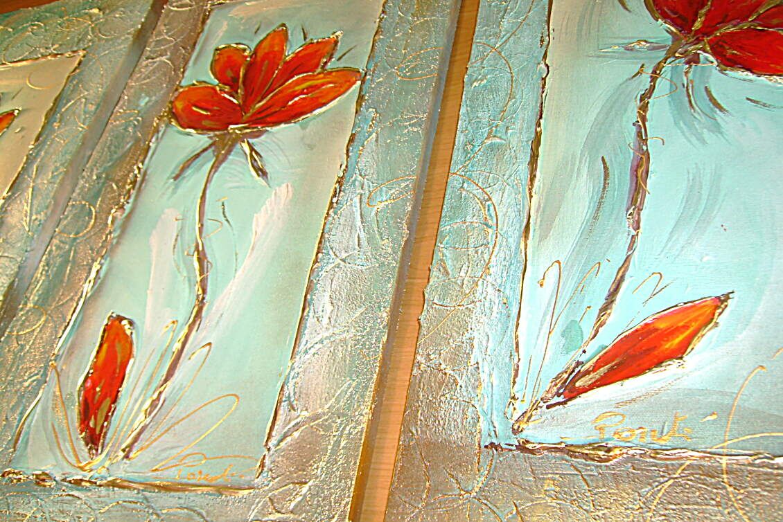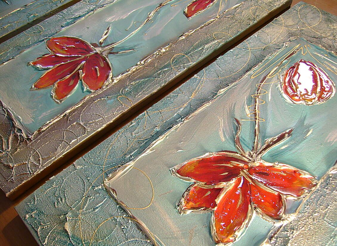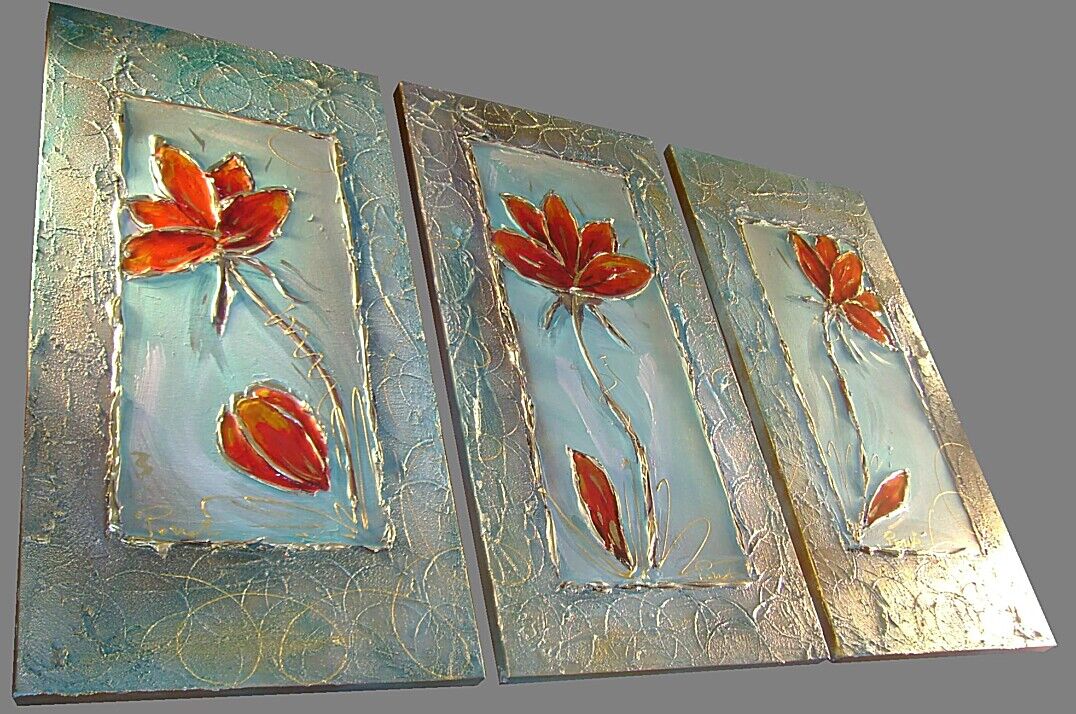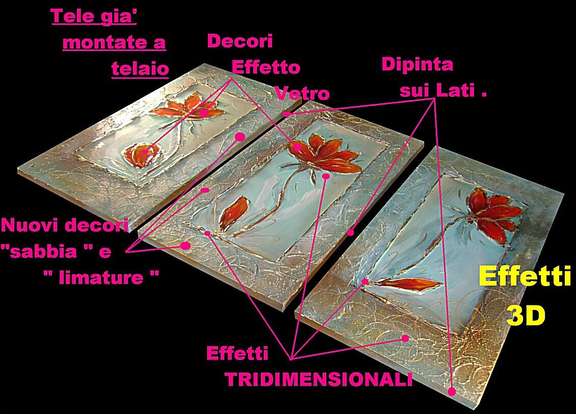 Opera realizzata in tecnica mista TRIDIMENSIONALE , mediante utilizzo di colori acrilici , pigmenti metallici , colori ad olio , resine epossidiche effetto cristallo ,paste acriliche , sabbia di fiume . L'opera e' composta 3 tele 30 x 60 x 2 cm . Il prezzo di vendita e' di 190 ,00 euro+spsp