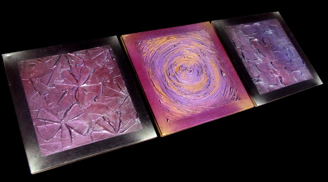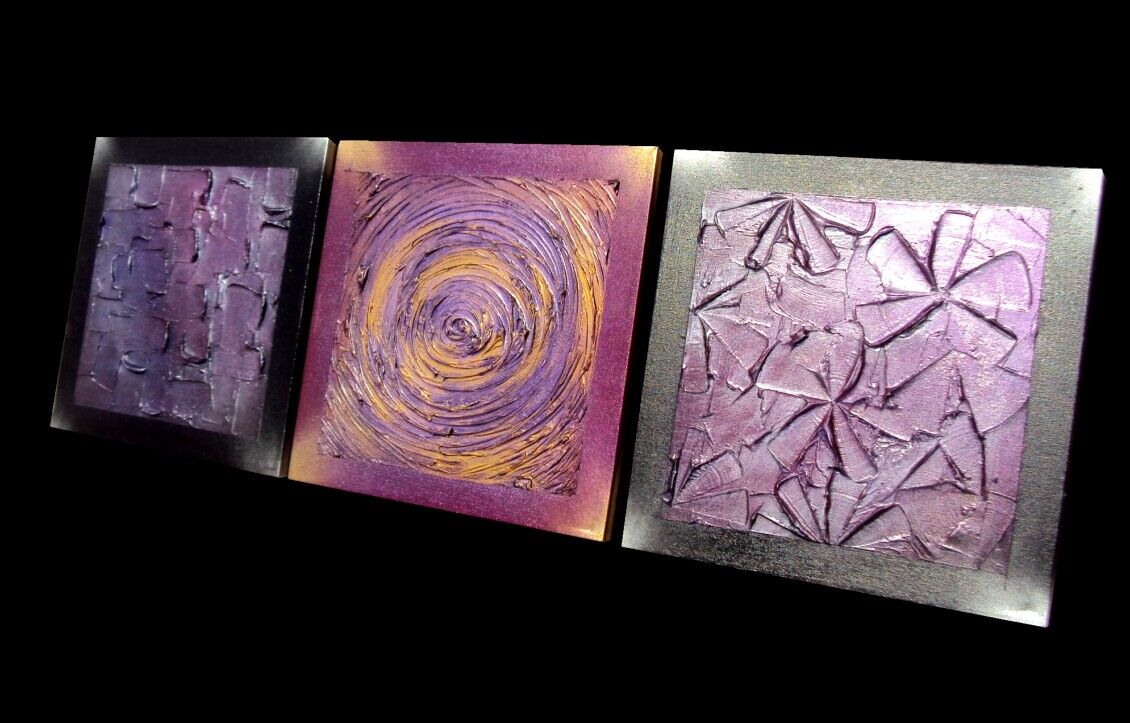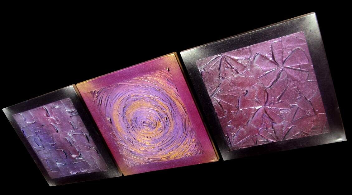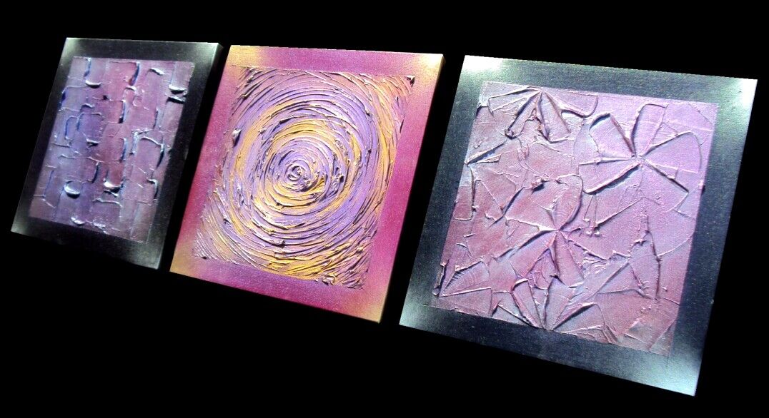 Opera realizzata in tecnica mista TRIDIMENSIONALE , mediante utilizzo di colori acrilici , pigmenti metallici , colori ad olio , paste acriliche , paste epossidiche. L'opera e' composta 3 tele 40 x 40 x 2 cm . Il prezzo di vendita e' di 190 ,00 euro+spsp