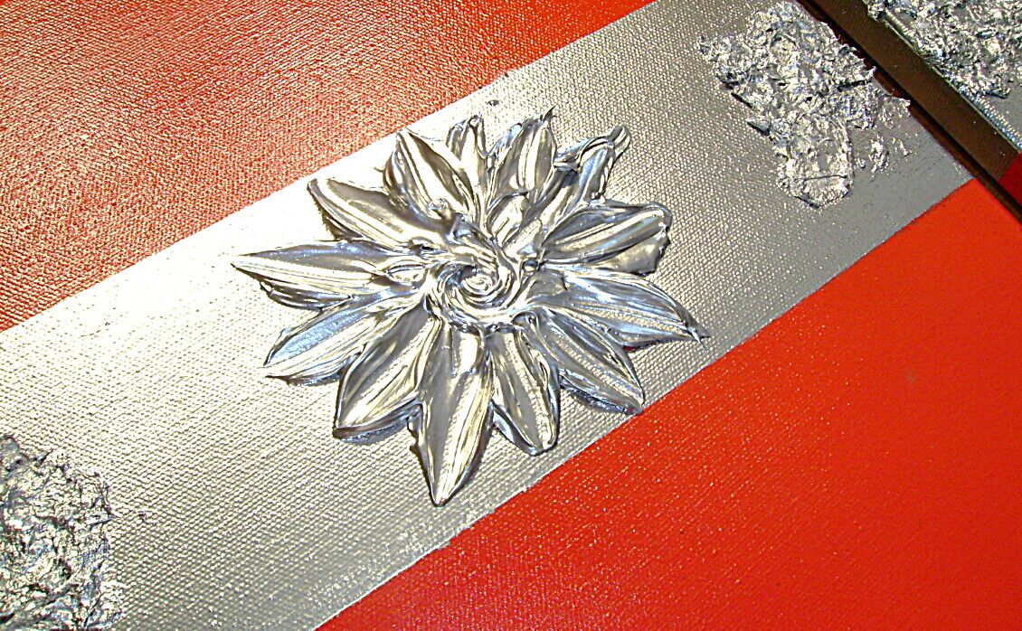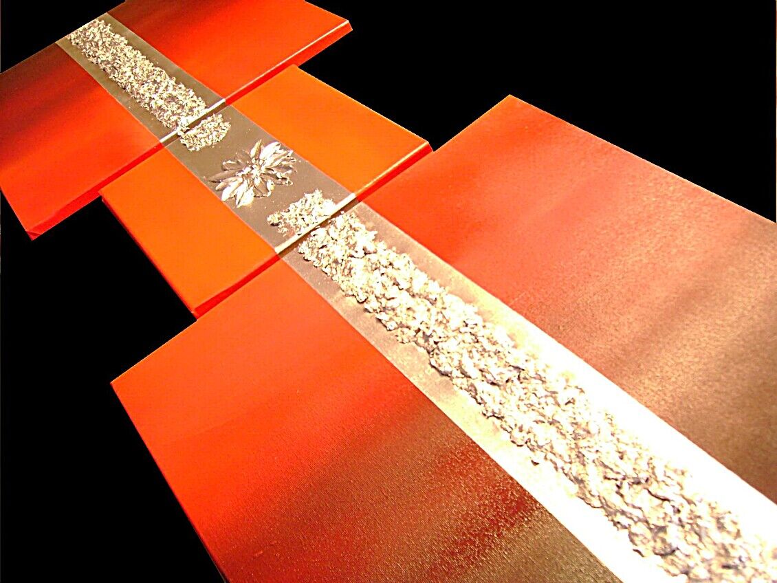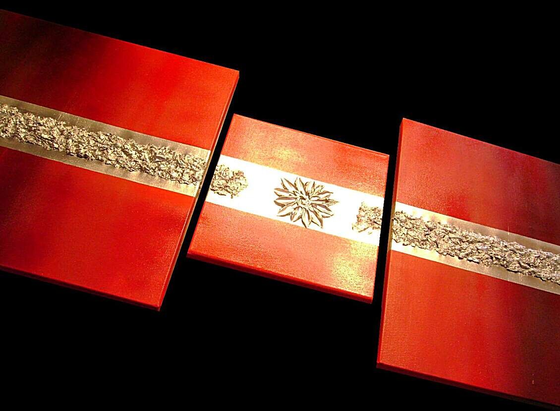 Opera realizzata in tecnica mista TRIDIMENSIONALE , mediante utilizzo di colori acrilici , pigmenti metallici , colori ad olio , paste acriliche , paste epossidiche , inserti. L'opera e' composta 1 tela 30 x 30 x 2 cm + 2 tele 50 x 50 x 2 cm . Il prezzo di vendita e' di 190 ,00 euro+spsp
