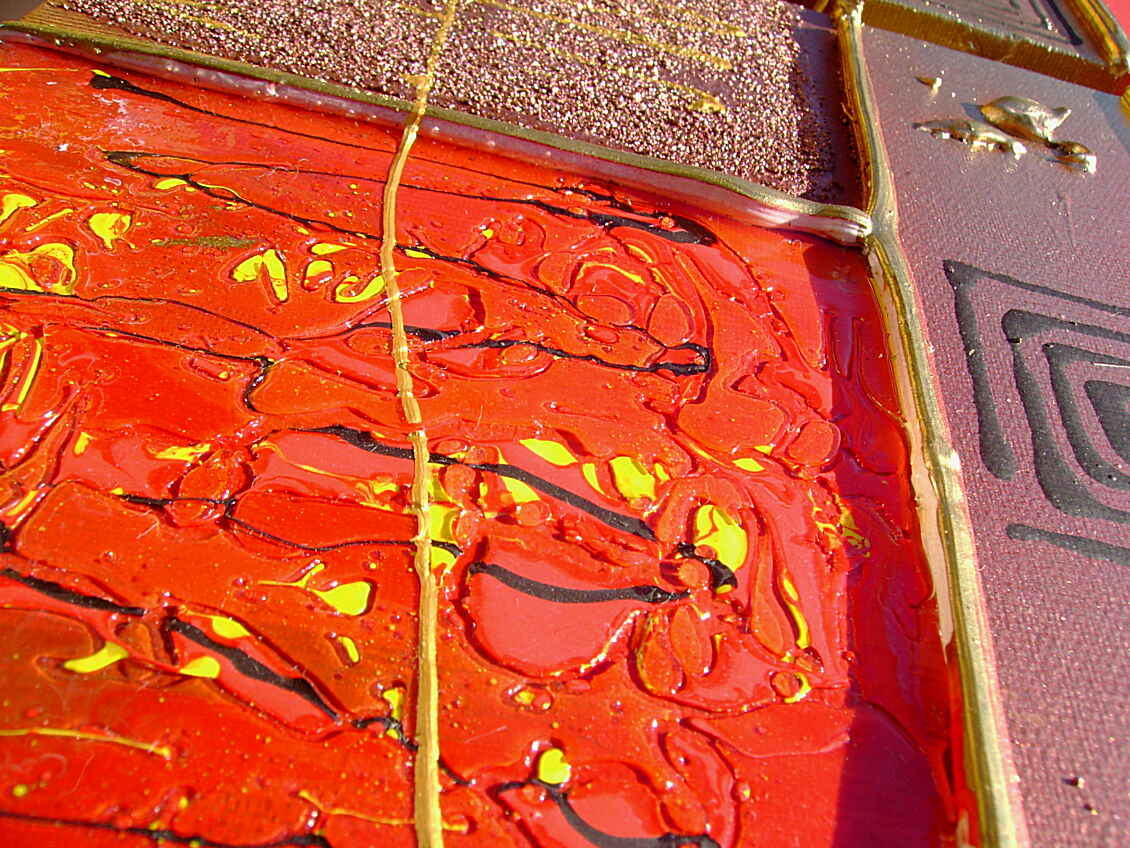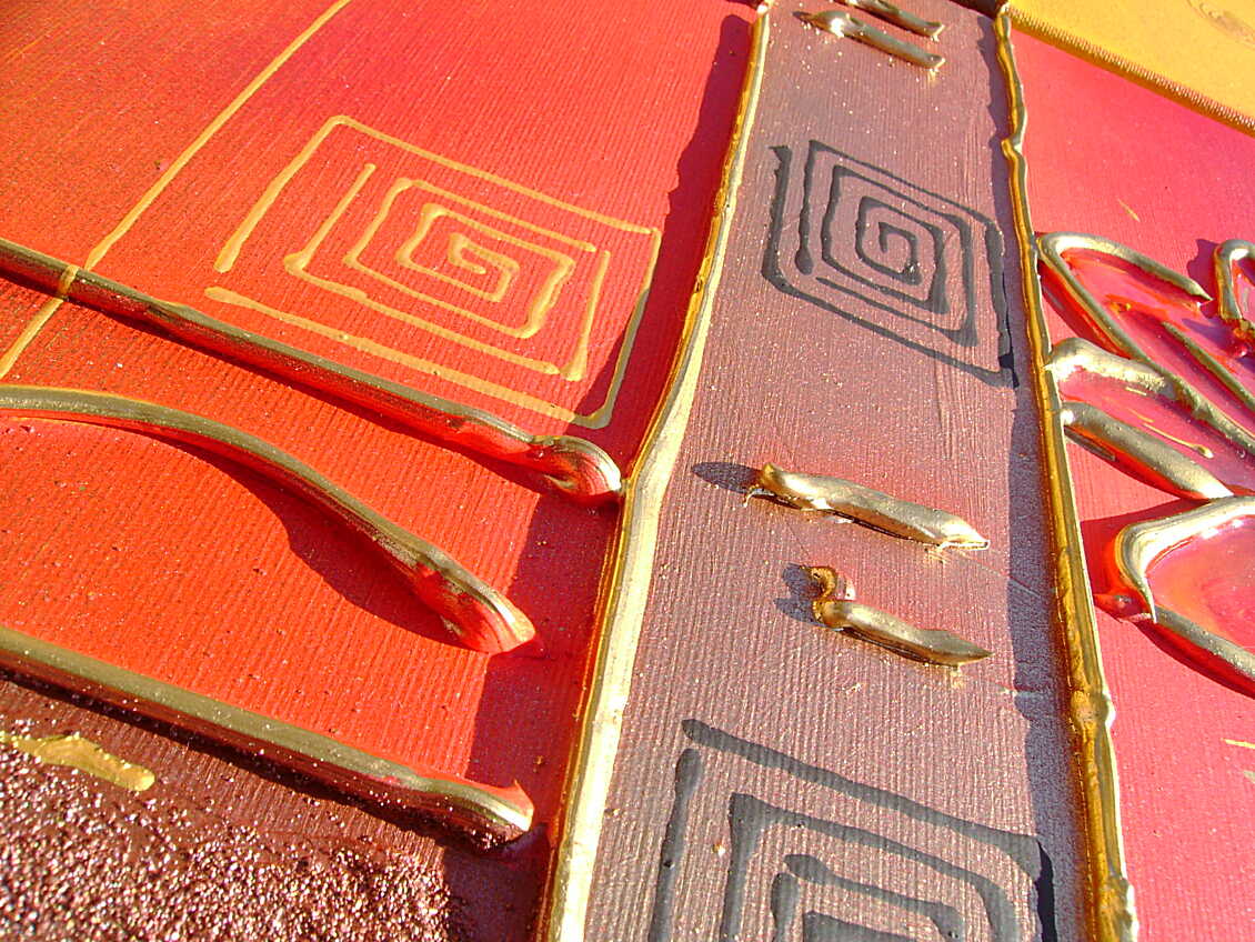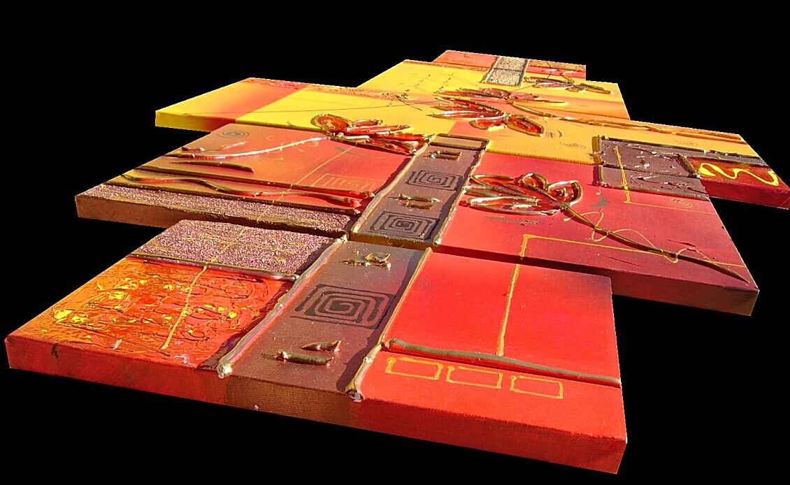 Opera realizzata in tecnica mista tridimensionale polimaterica ,mediante l'utilizzo di colori acrilici , olii e metallici , resine ad effetto vetro , paste acriliche ed inserti di sabbia di fiume . L'opera , e' composta da 1 tela 30 x 60 x 2 cm + 1 tela 40 x 80 x 2 cm + 1 tela 40x 40 x 2 cm + 2 tele 20 x 30 x 2 cm. Il prezzo di vendita e' di 230 ,00 euro+spsp