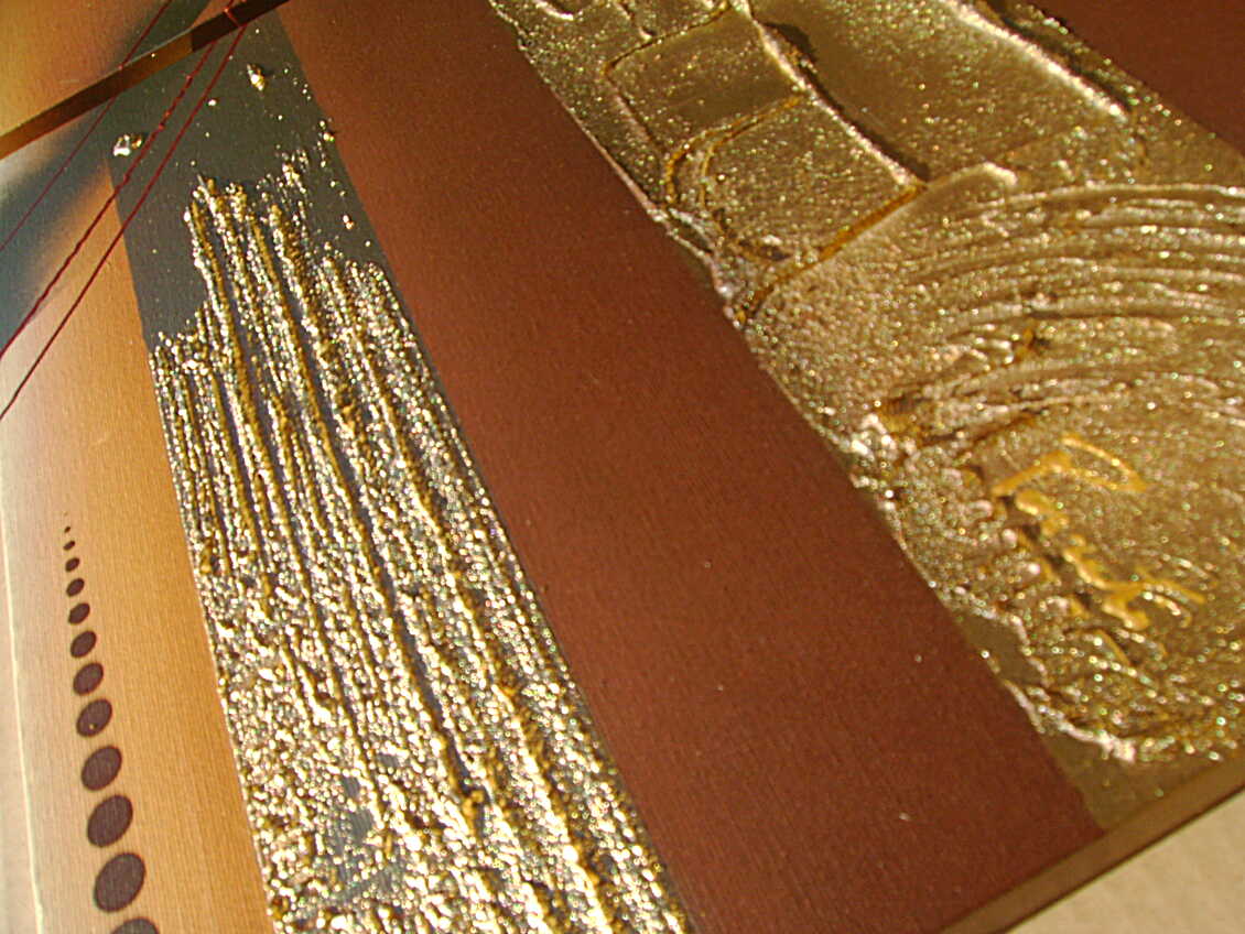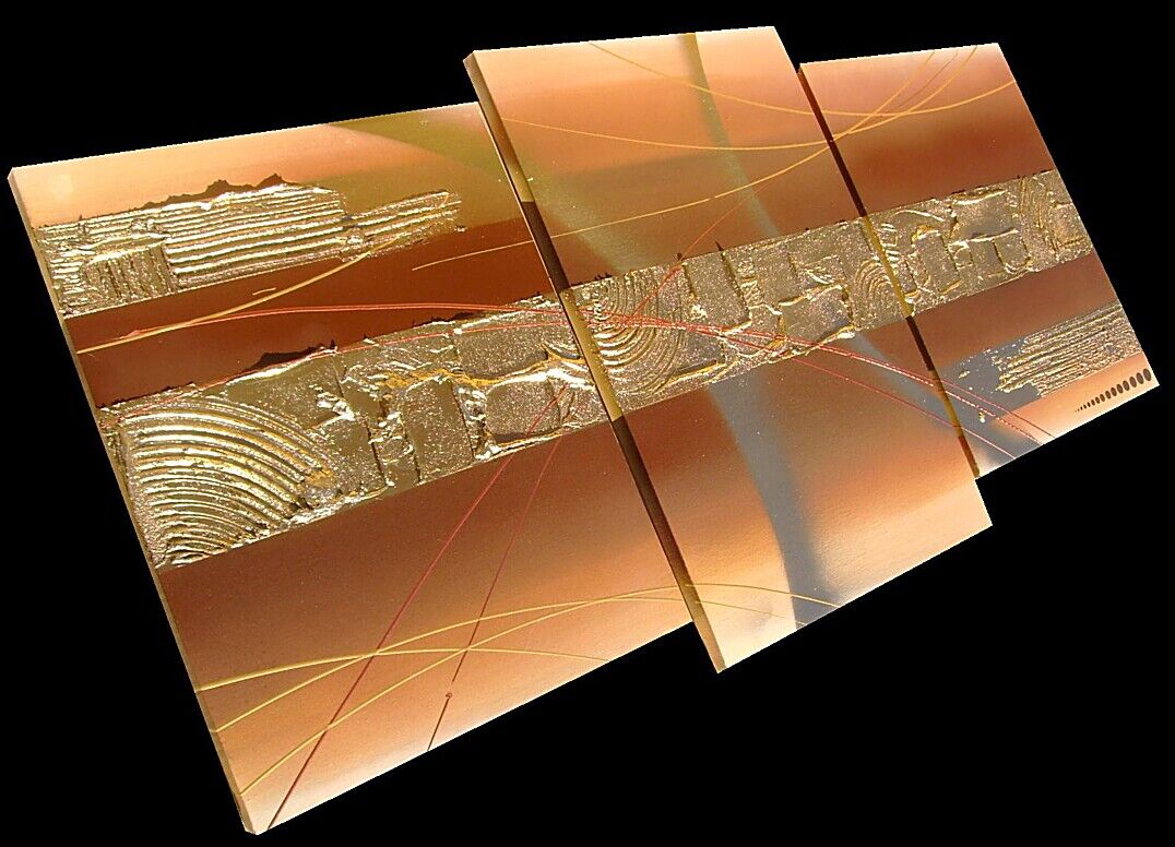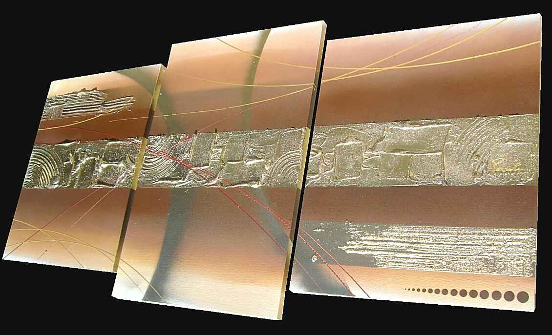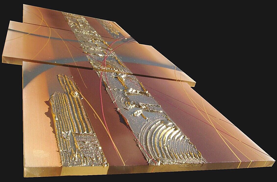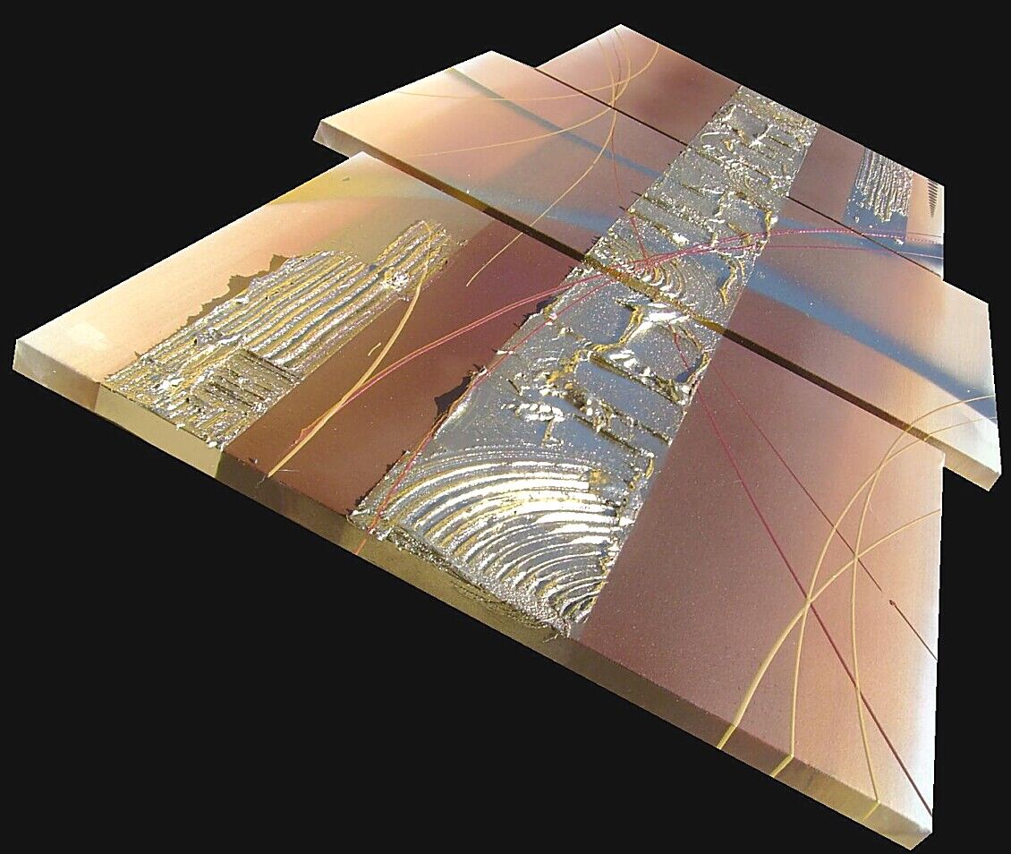 Opera realizzata in tecnica mista 3d polimaterica ,mediante l'utilizzo di colori acrilici , olii e metallici, pigmenti metallici , oro , resine e paste acriliche, limature metalliche . L'opera , e' composta da 2 tele 40 x 50 x 2 cm + 1 tela 40 x 60 x 2 cm. Il prezzo di vendita e' di 210 ,00 euro+spsp
