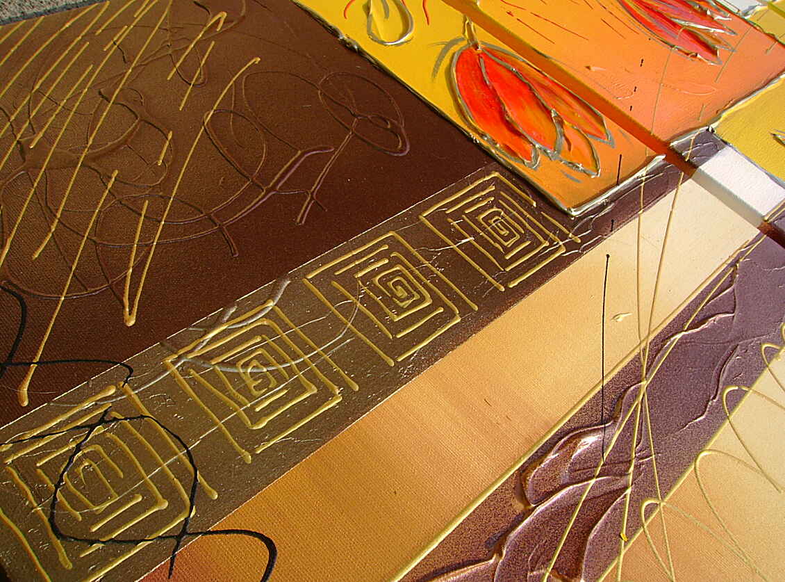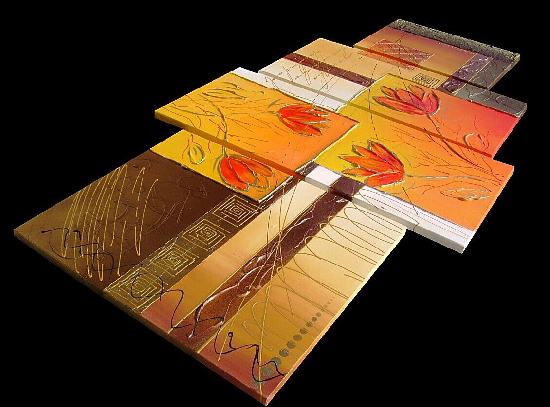 Opera realizzata in tecnica mista tridimensionale polimaterica,mediante l'utilizzo di colori acrilici , olii e metallici , resine epossidiche , paste acriliche,sabbie di fiume, resine effetto cristallo nei petali dei fiori . L'opera , e' composta da 1 tela 30 x 40 x 2 cm + 1 tela 30 x 60 x 2 cm + 1 tela 30 x 70 x 2 cm + 1 tela 40 x 50 x 2 cm. Il prezzo di vendita e' di 210 ,00 euro+spsp