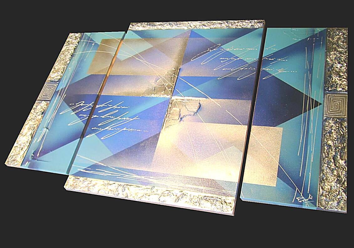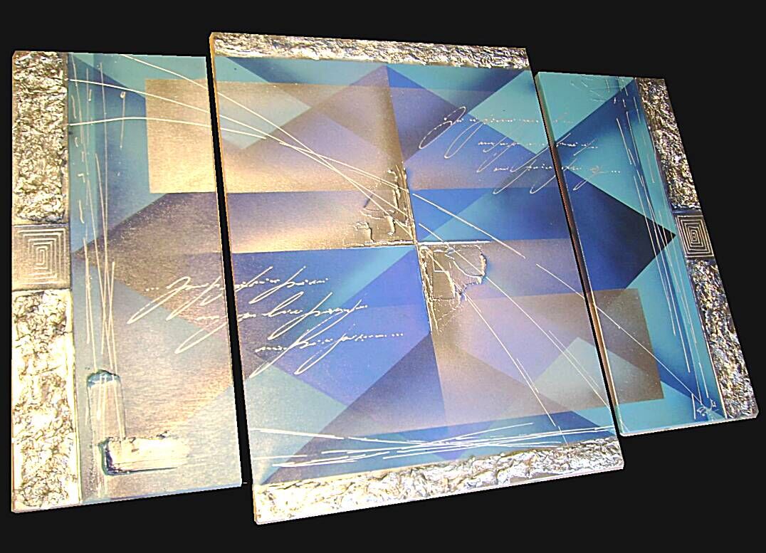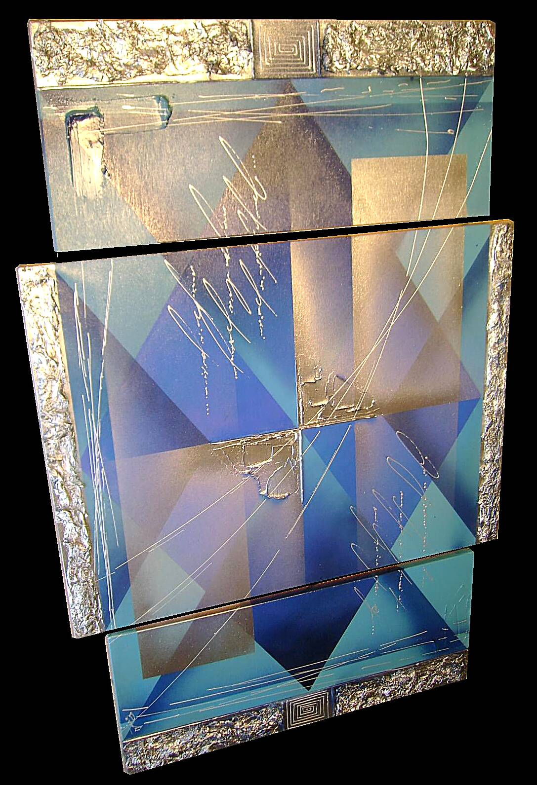 Opera realizzata in tecnica mista ,mediante l'utilizzo di colori acrilici , olii e metallici , paste acriliche . L'opera , e' composta da 1 tela 60 x 80 x 2 cm + 2 tele 30 x 70 x 2 cm . Il prezzo di vendita e' di 210 ,00 euro+spsp
