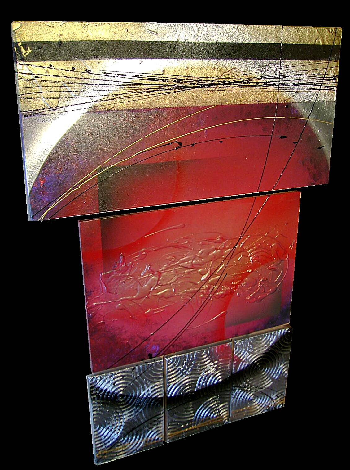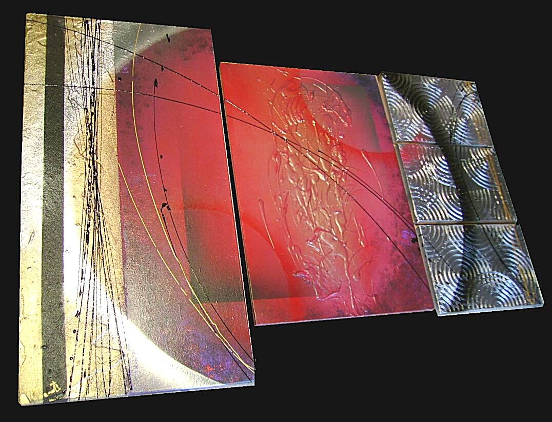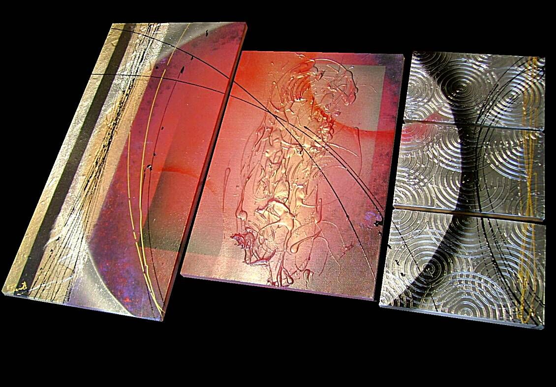Opera realizzata in tecnica mista ,mediante l'utilizzo di colori acrilici , olii e metallici , paste acriliche . L'opera , e' composta da 1 tela 40 x 80 x 2 cm + 1 tela 40 x 60 x 2 cm + 3 tele 30 x 20 x 2 cm . Il prezzo di vendita e' di 220 ,00 euro+spsp