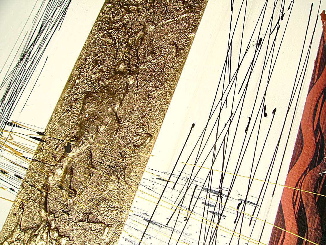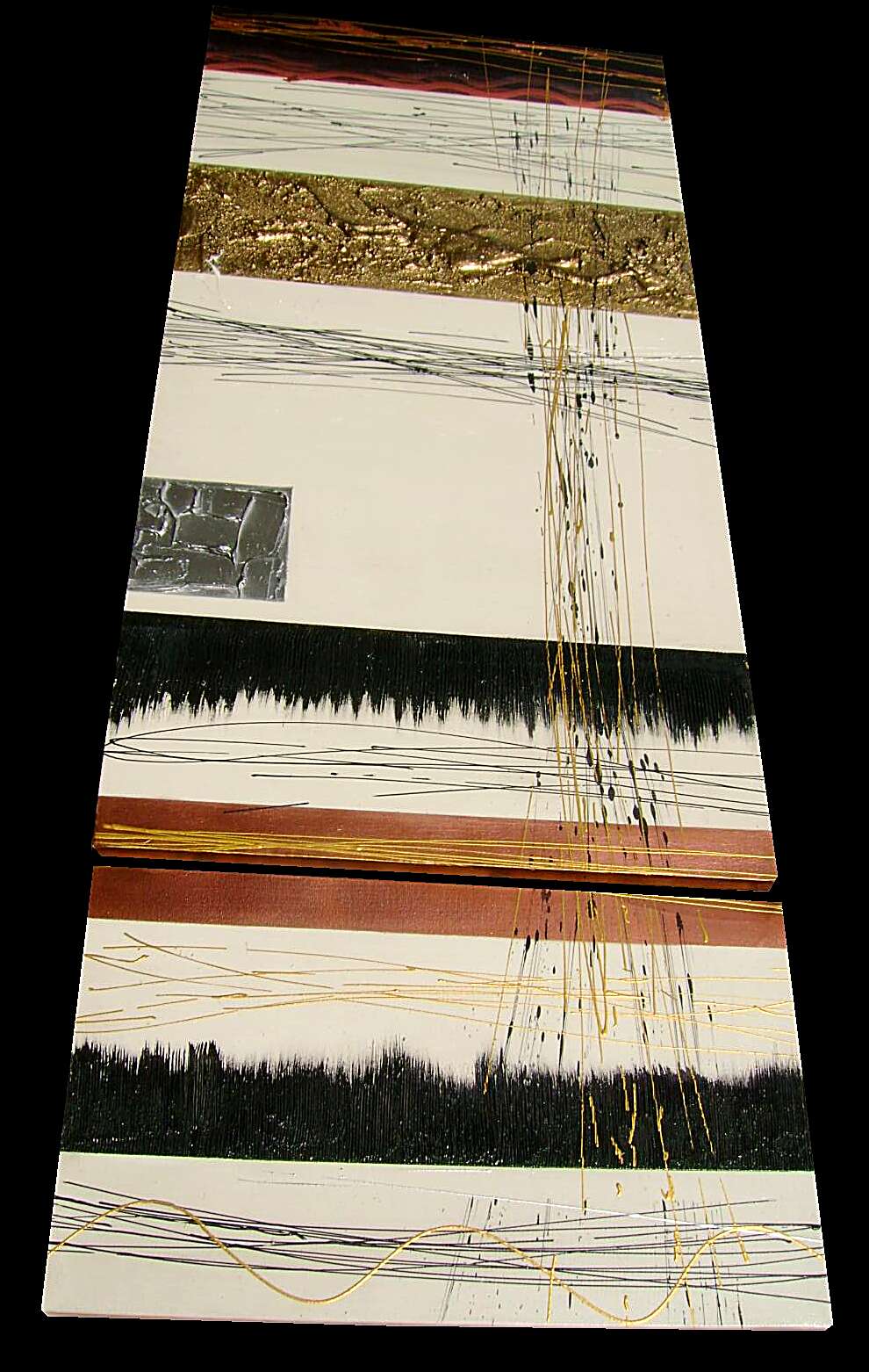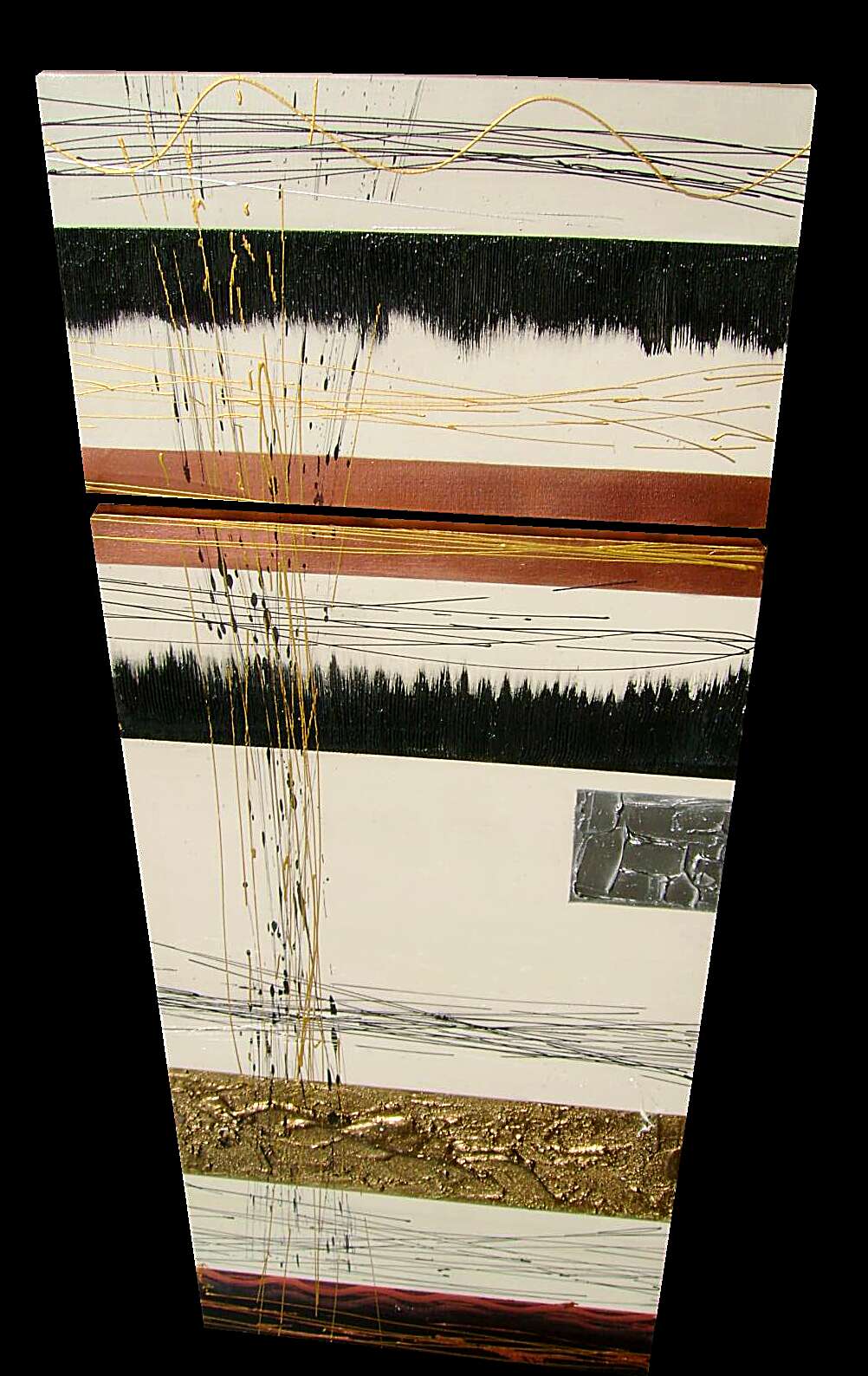 Opera realizzata in tecnica mista ,mediante l'utilizzo di colori acrilici , olii e metallici , paste acriliche . L'opera , e' composta da 1 tela 100 x 50 x 2 cm + 1 tela 30 x 50 x 2 cm . Il prezzo di vendita e' di 260 ,00 euro+spsp