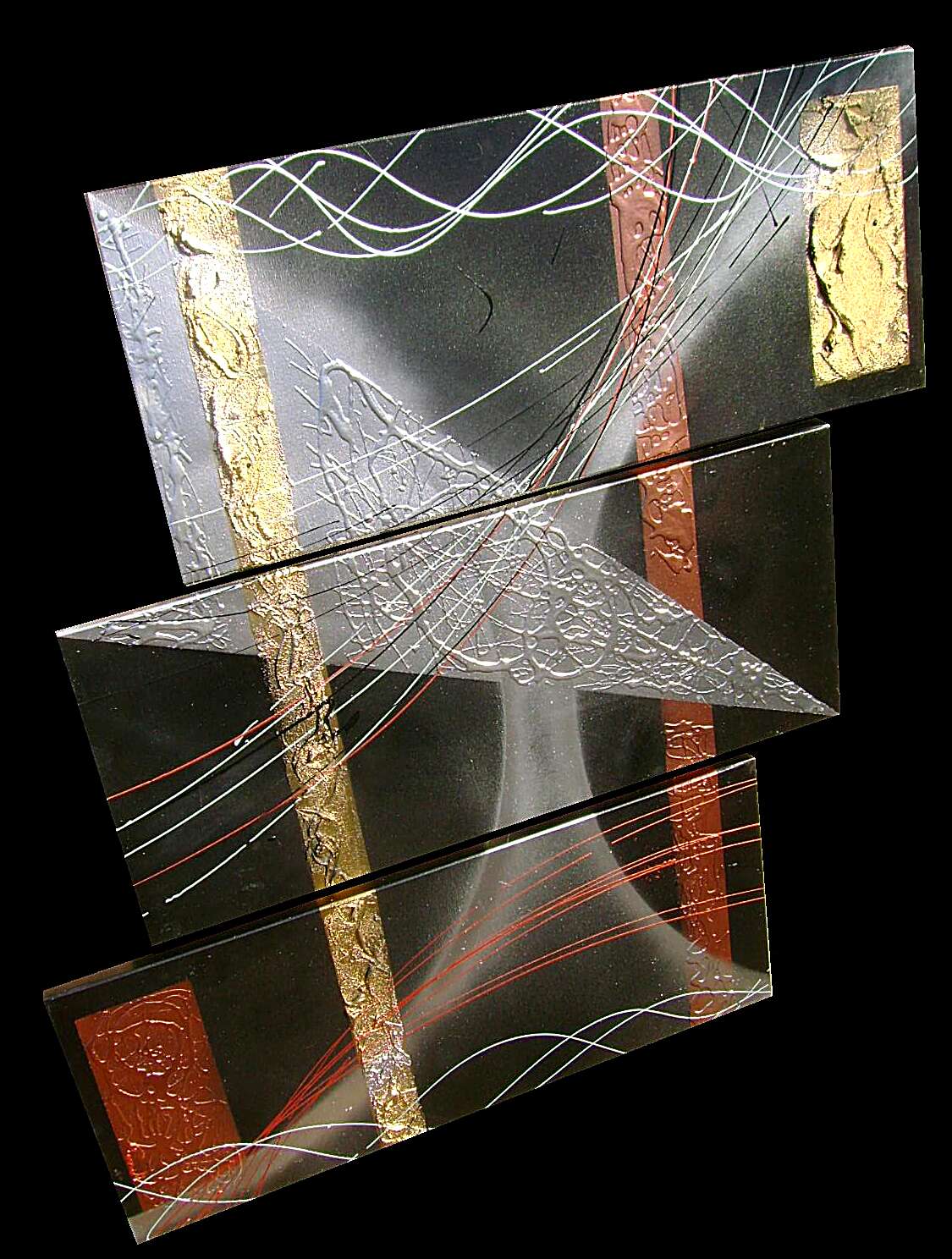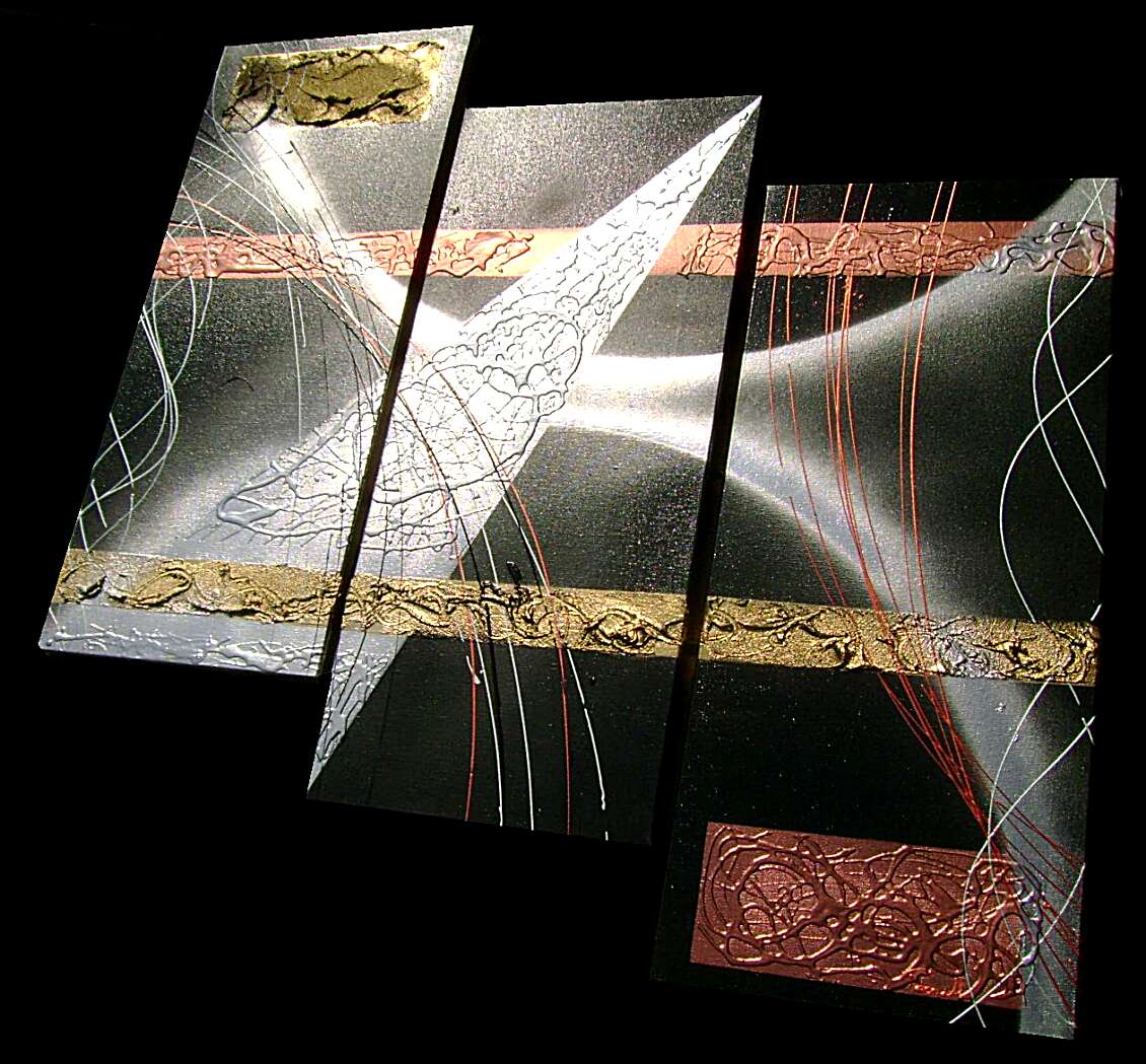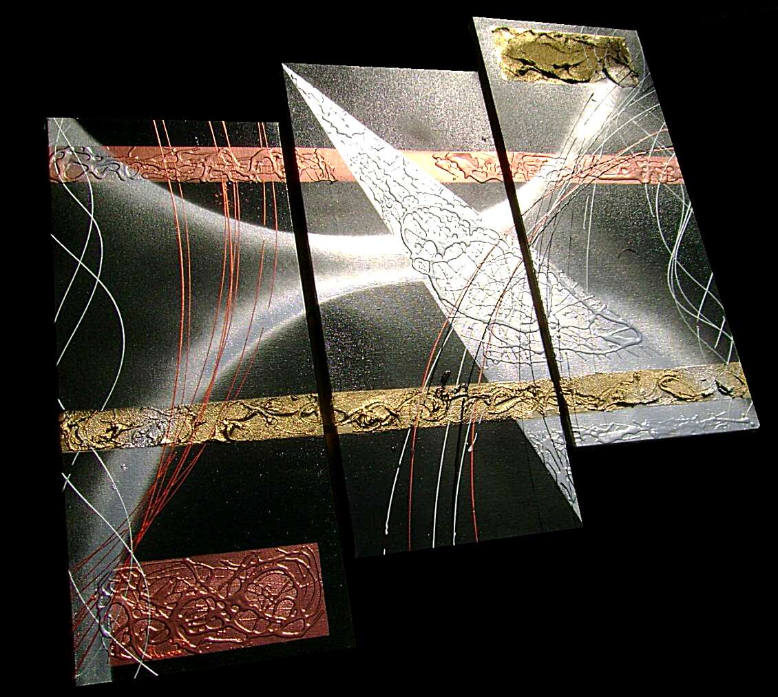 Opera realizzata in tecnica mista ,mediante l'utilizzo di colori acrilici , olii e metallici , paste acriliche . L'opera , e' composta da 3 tele 30 x 70 x 2 cm . Il prezzo di vendita e' di 220 ,00 euro+spsp