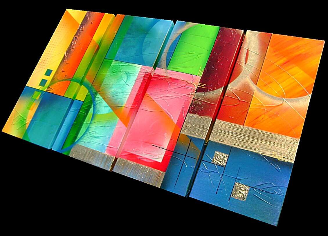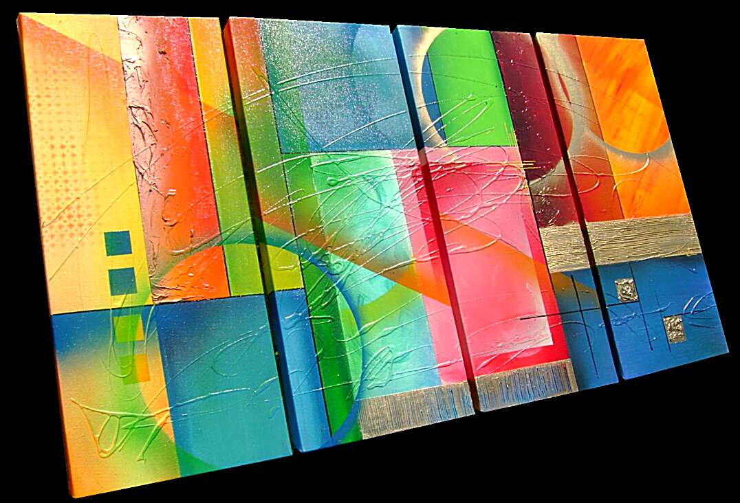 Opera realizzata in tecnica mista ,mediante l'utilizzo di colori acrilici , olii e metallici , paste acriliche . L'opera , e' composta da 4 tele 30 x 70 x 4 cm . Il prezzo di vendita e' di 220 ,00 euro+spsp