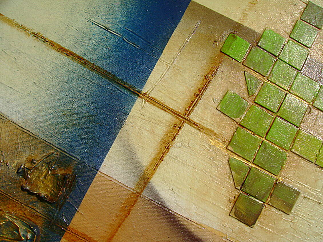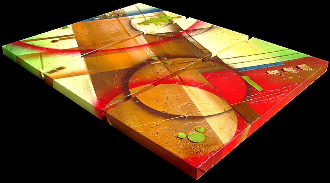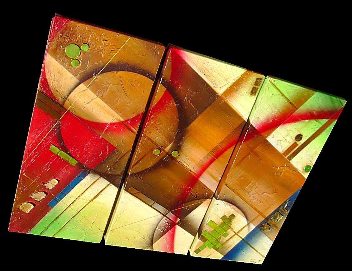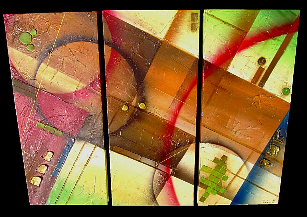 Opera realizzata in tecnica mista ,mediante l'utilizzo di colori acrilici , olii e metallici , paste acriliche . L'opera , e' composta da 3 tele 30 x 70 x 3,5 cm . Il prezzo di vendita e' di 230 ,00 euro+spsp