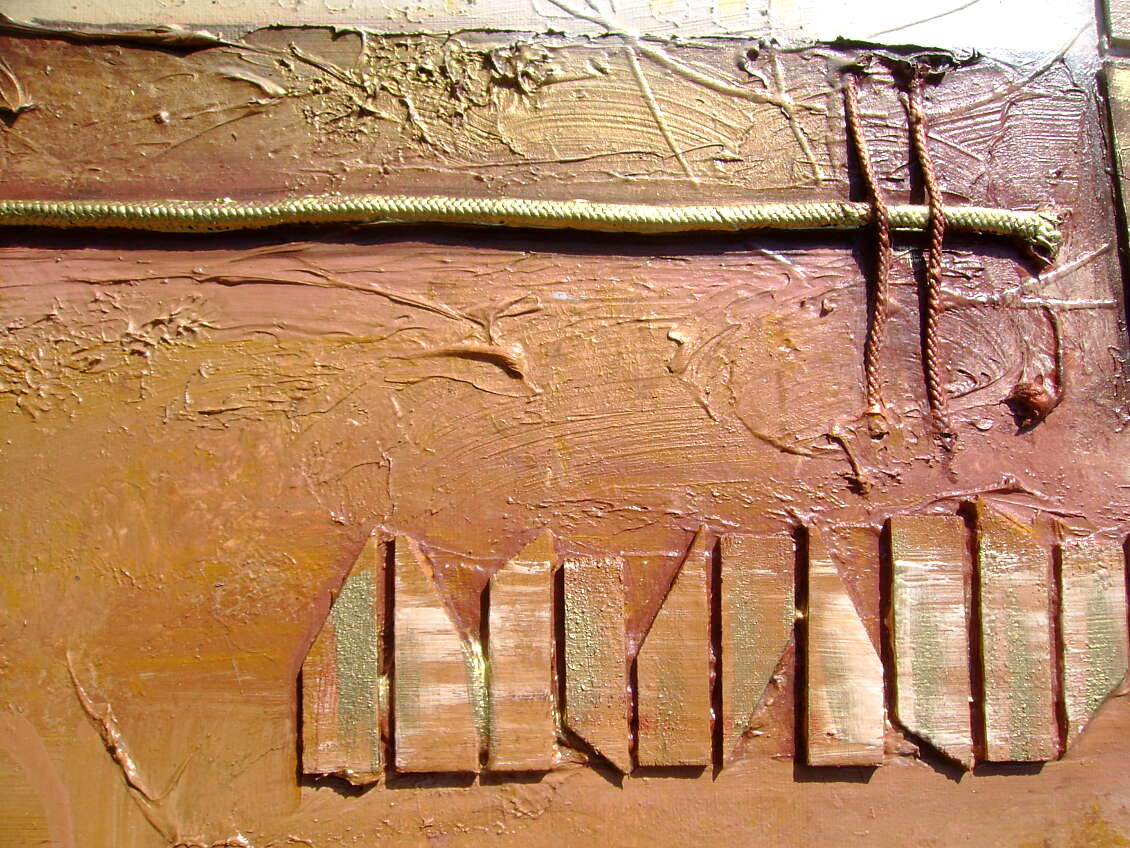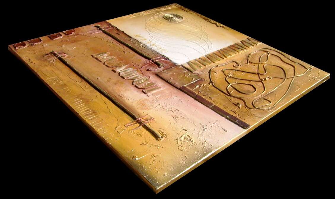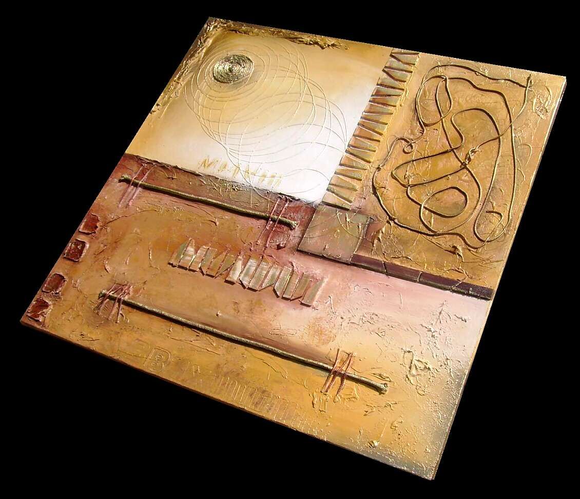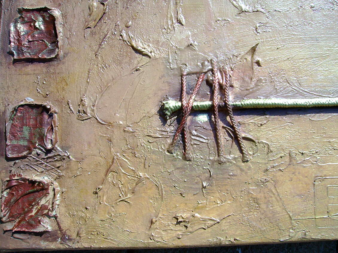 Opera realizzata in tecnica mista ,mediante l'utilizzo di colori acrilici , olii e metallici , paste acriliche, inserti di corda e legno . L'opera , e' composta da 1 tela 80 x 80 x 2 cm . Il prezzo di vendita e' di 220 ,00 euro+spsp