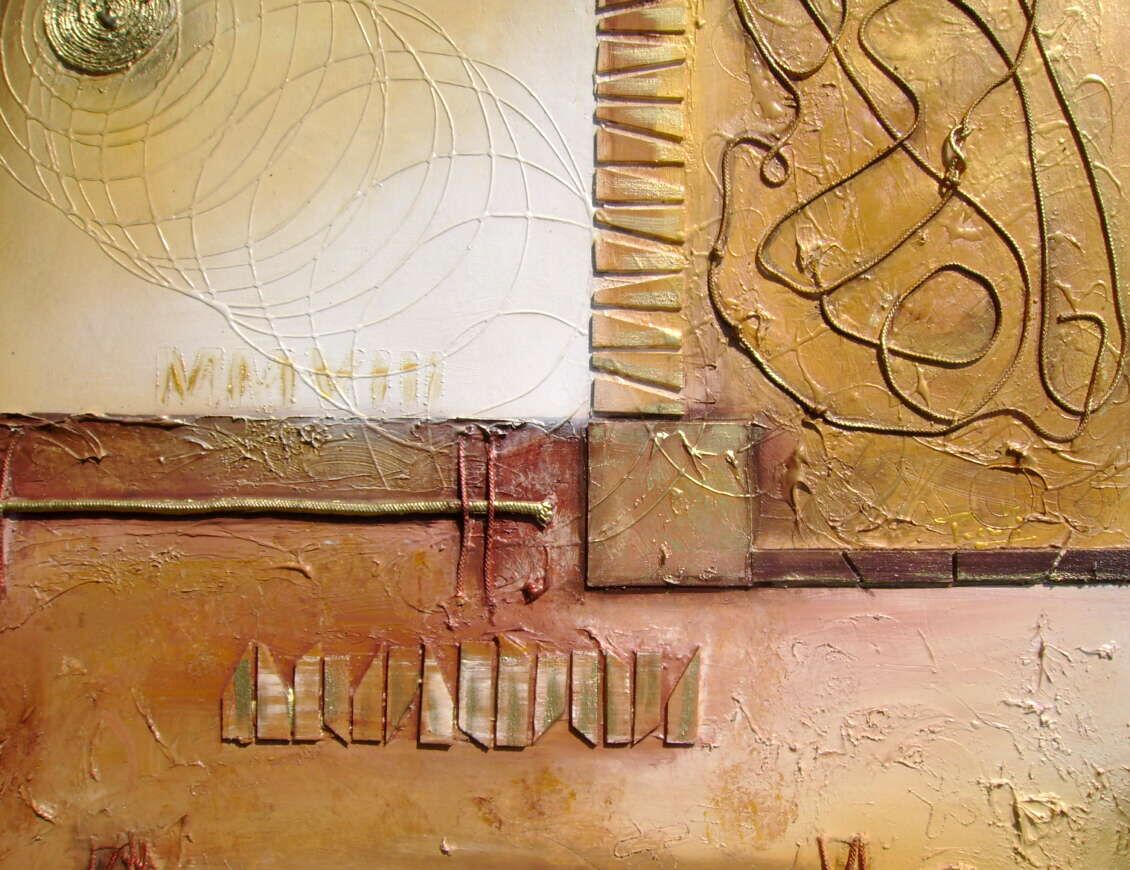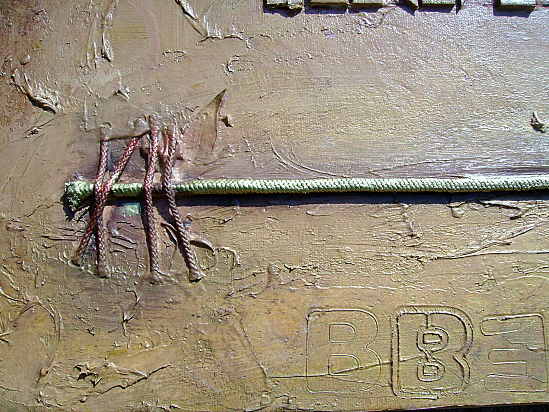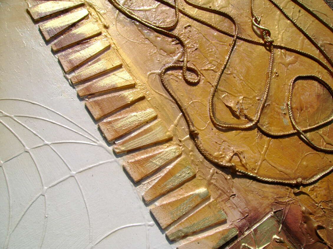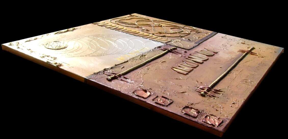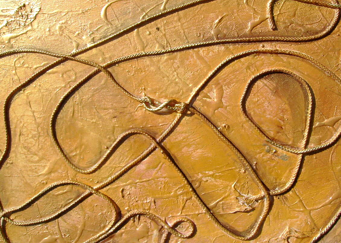 Opera realizzata in tecnica mista ,mediante l'utilizzo di colori acrilici , olii e metallici , paste acriliche, inserti di corda e legno . L'opera , e' composta da 1 tela 80 x 80 x 2 cm . Il prezzo di vendita e' di 220 ,00 euro+spsp