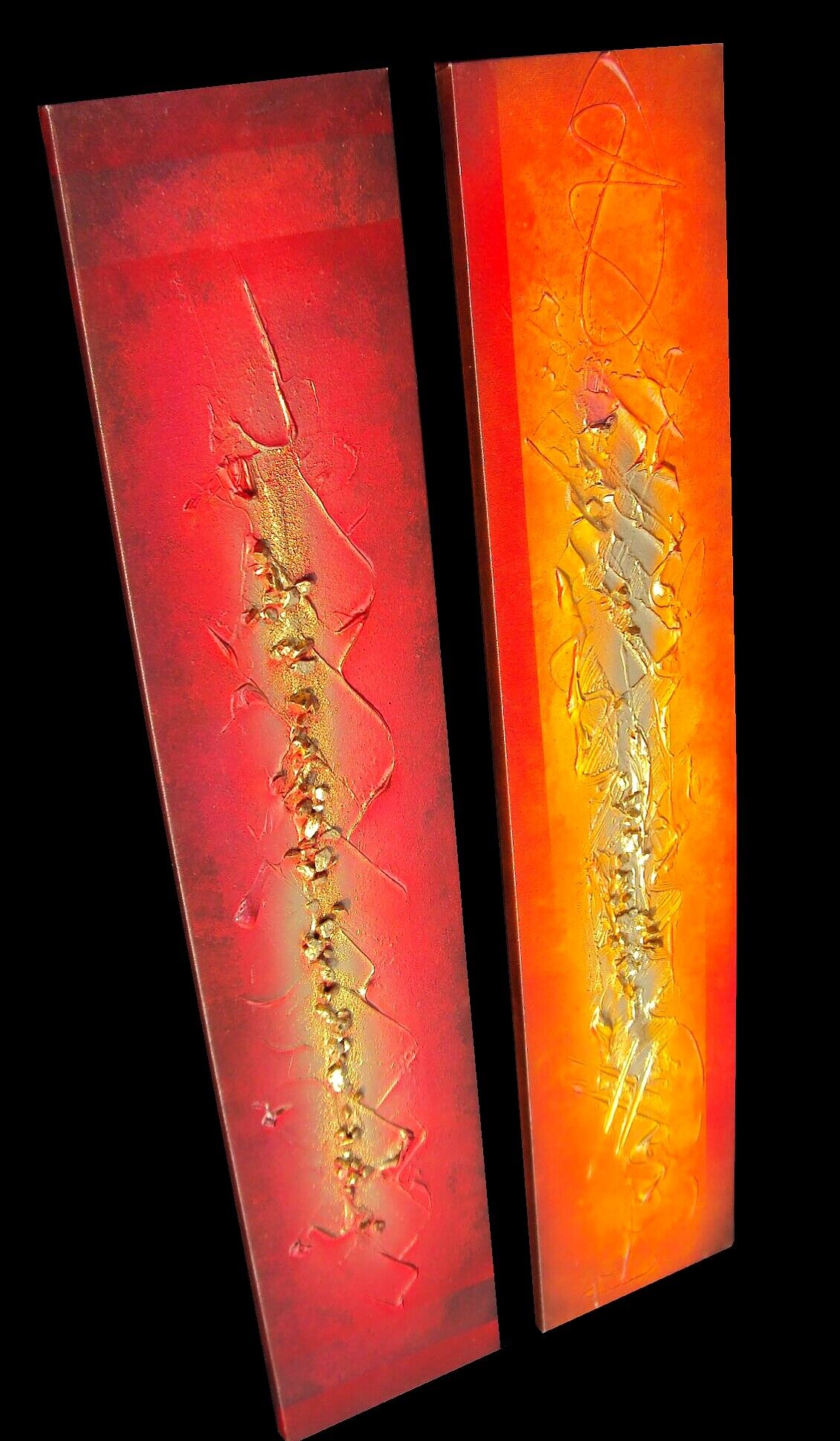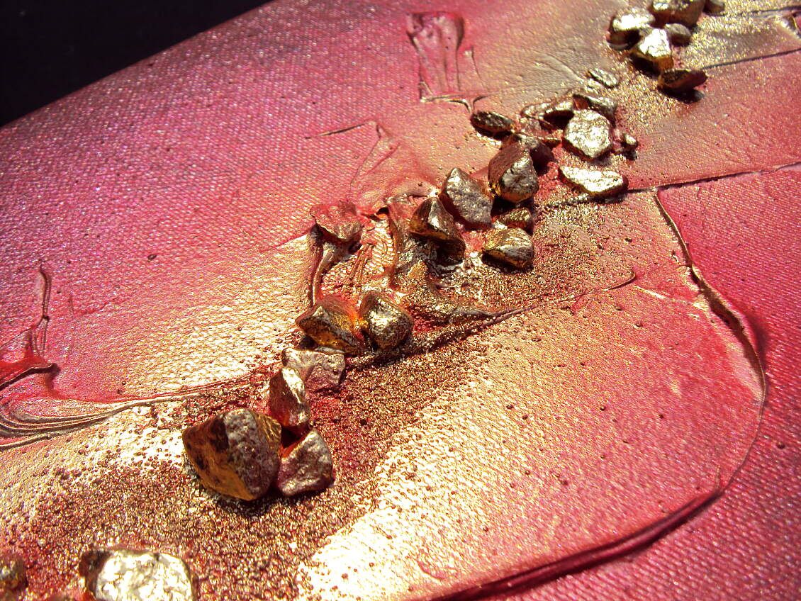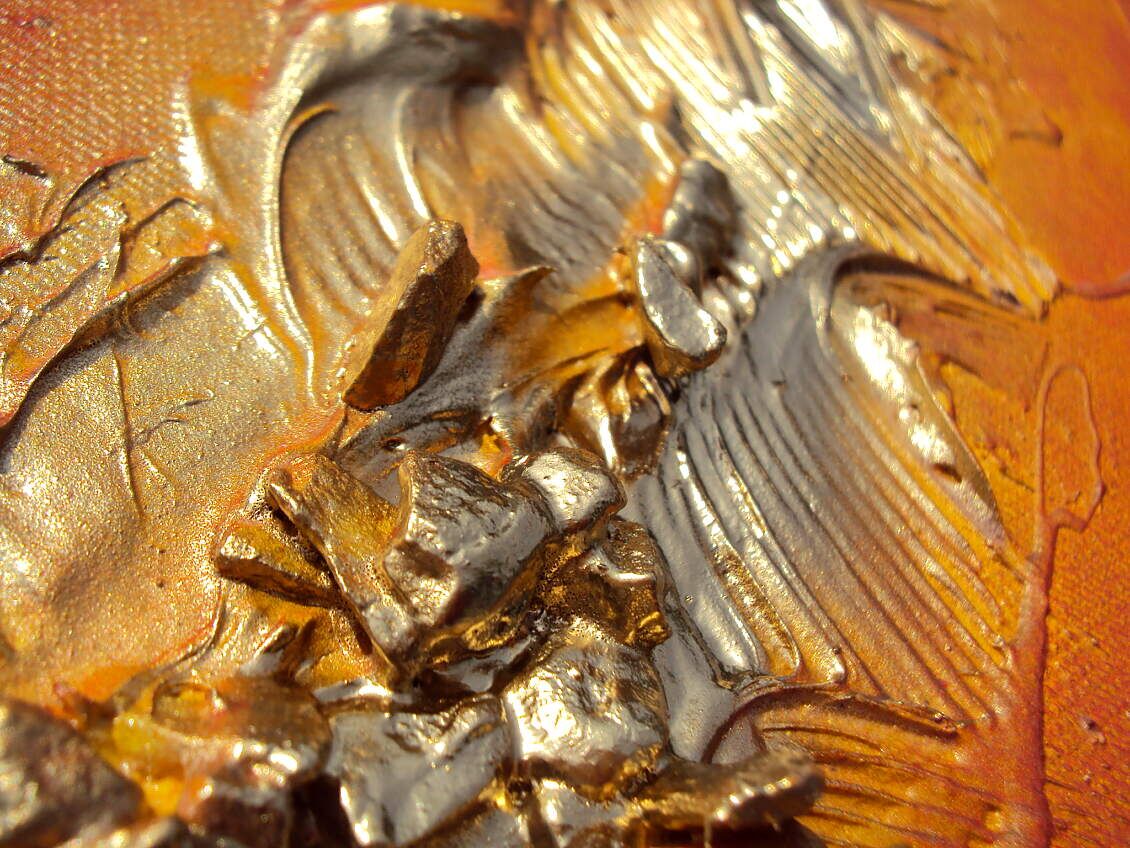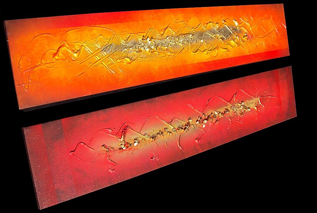 Opera realizzata in tecnica mista TRIDIMENSIONALE , mediante utilizzo di colori acrilici , pigmenti metallici , colori ad olio , resine epossidiche effetto cristallo ,paste acriliche , sabbia di fiume, inseri in pelle ecologica . L'opera e' composta da 2 tele cm 20 x cm 100 x cm 2 . 230,00 EURO + SP SP