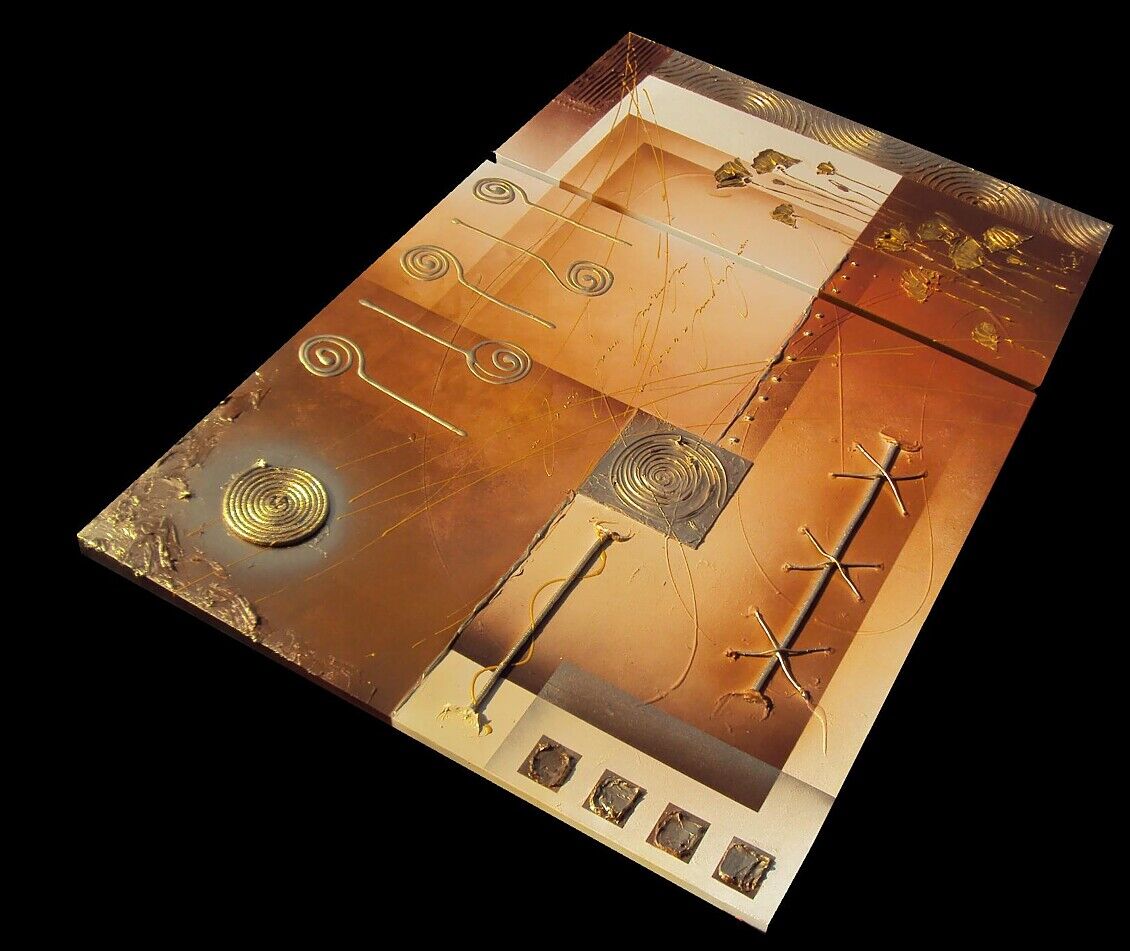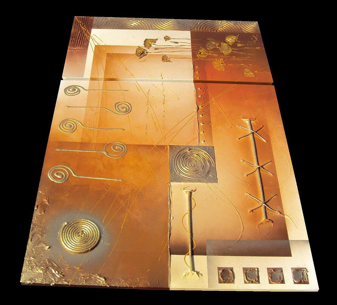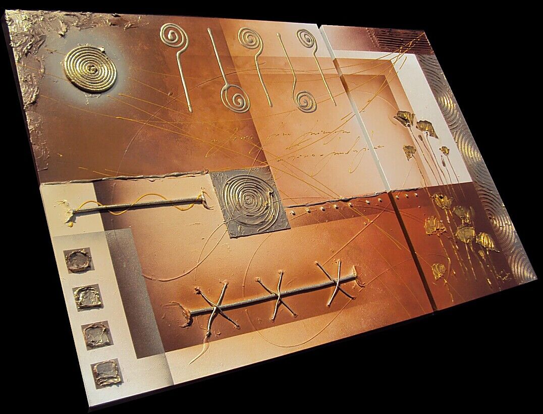 Opera realizzata in tecnica mista ,mediante l'utilizzo di colori acrilici , colori ad olio, colori e pigmenti metallici , resine epossidiche e paste acriliche, inserti multimaterici. L'opera , e' composta 1 tela 80 x 80 x 2 cm + 1 tela 40 x 80 x 2 cm . Il prezzo di vendita e' di 260 ,00 euro+spsp