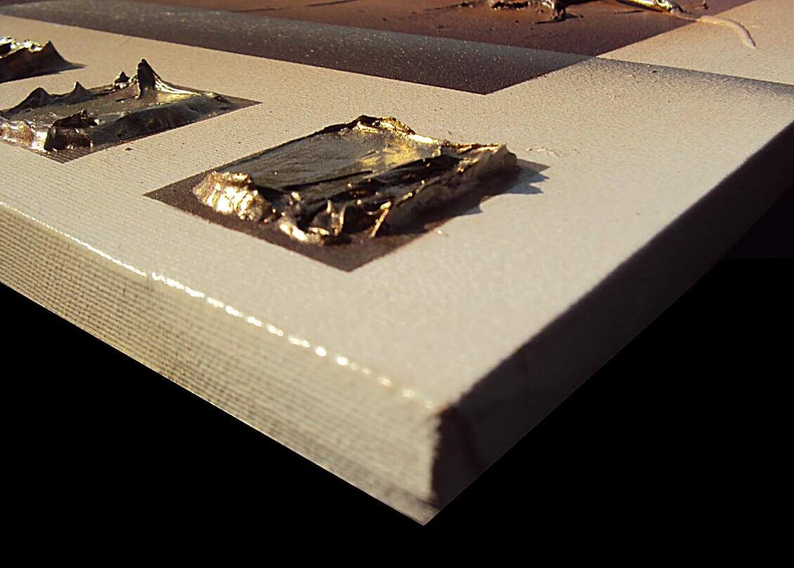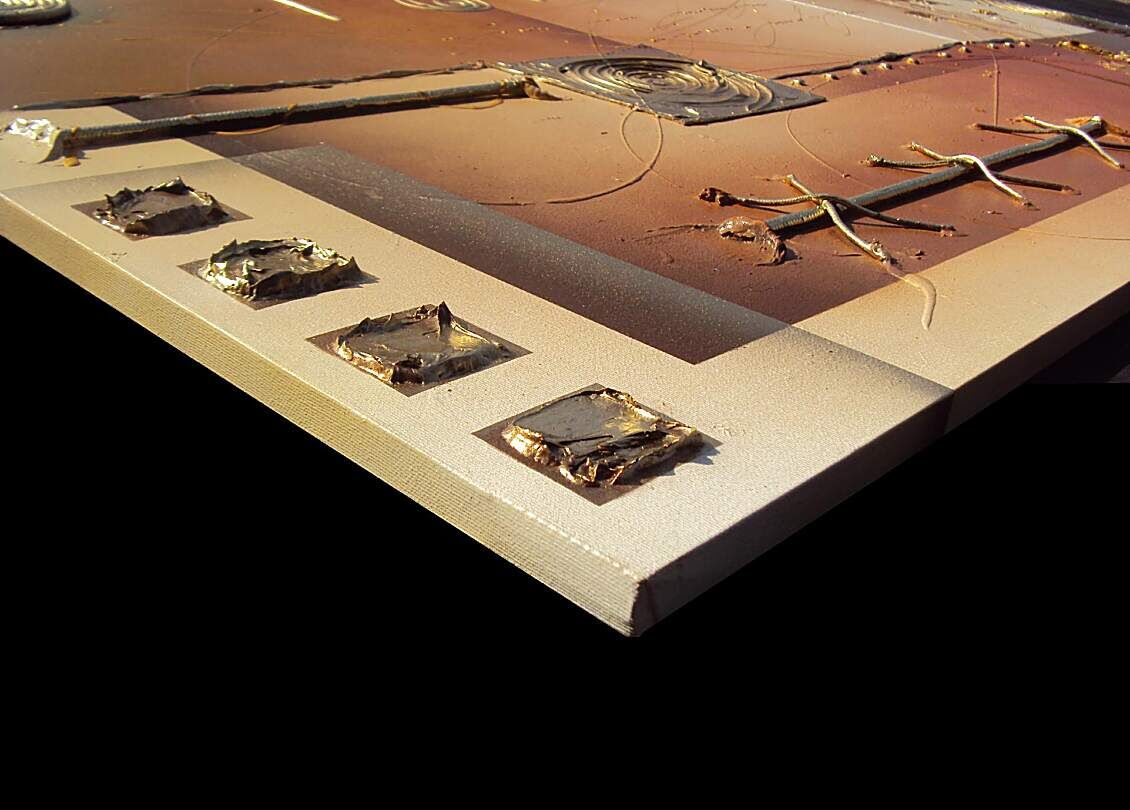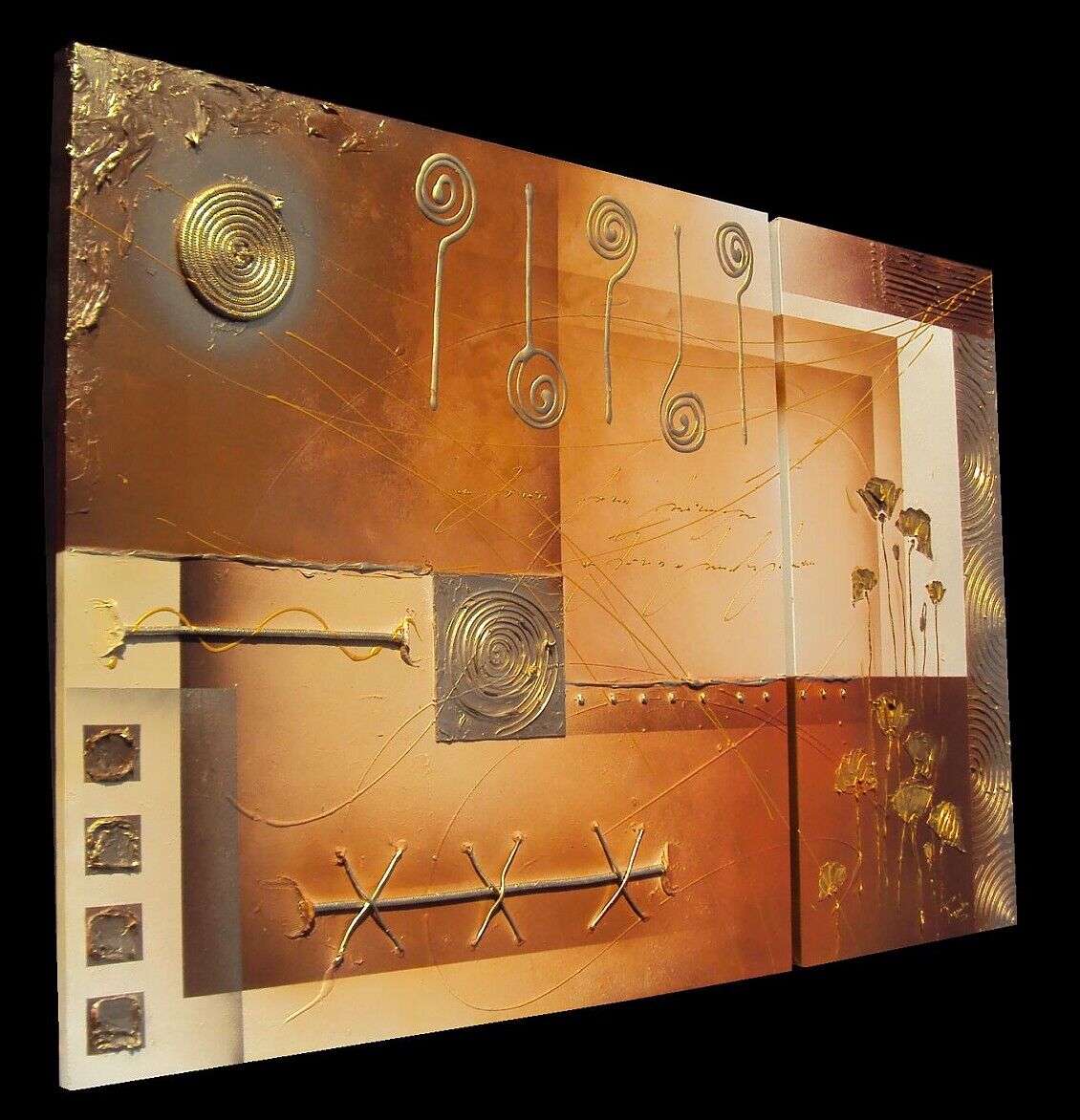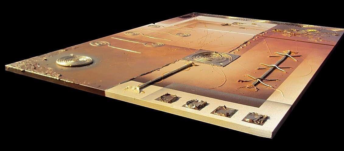 Opera realizzata in tecnica mista ,mediante l'utilizzo di colori acrilici , colori ad olio, colori e pigmenti metallici , resine epossidiche e paste acriliche, inserti multimaterici. L'opera , e' composta 1 tela 80 x 80 x 2 cm + 1 tela 40 x 80 x 2 cm . Il prezzo di vendita e' di 260 ,00 euro+spsp