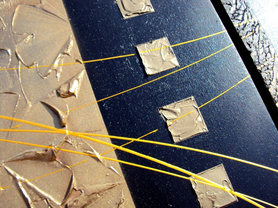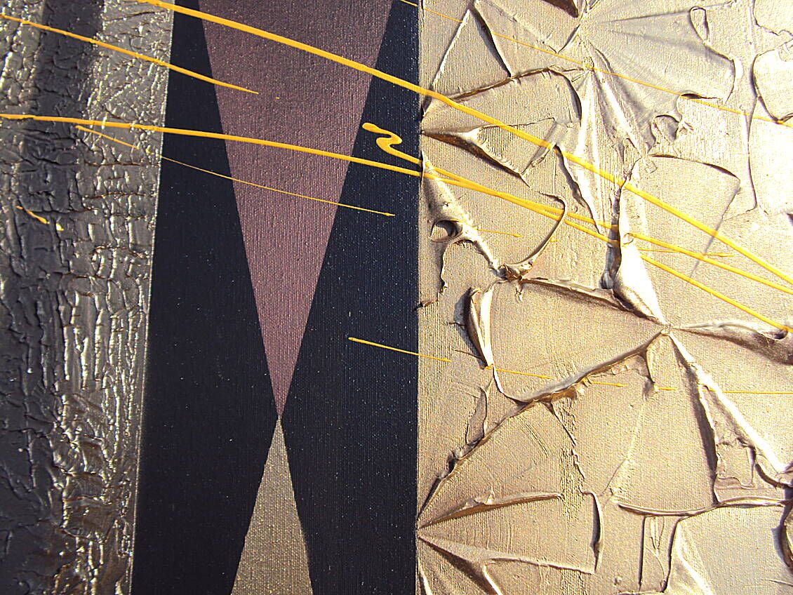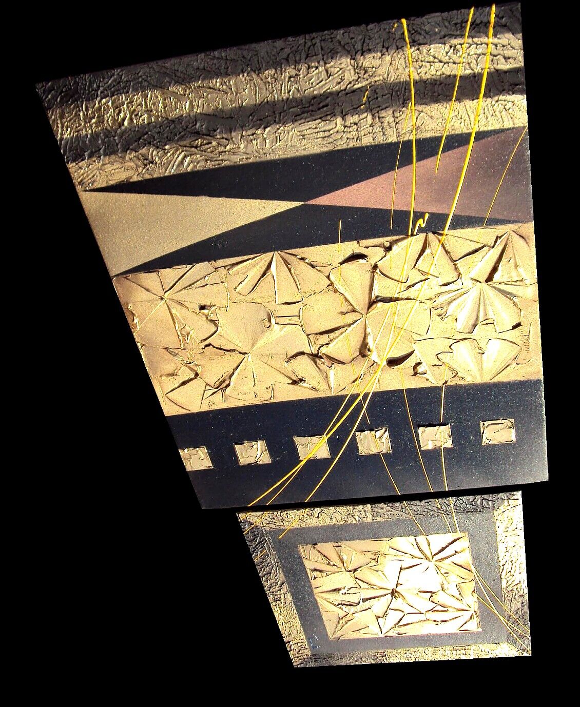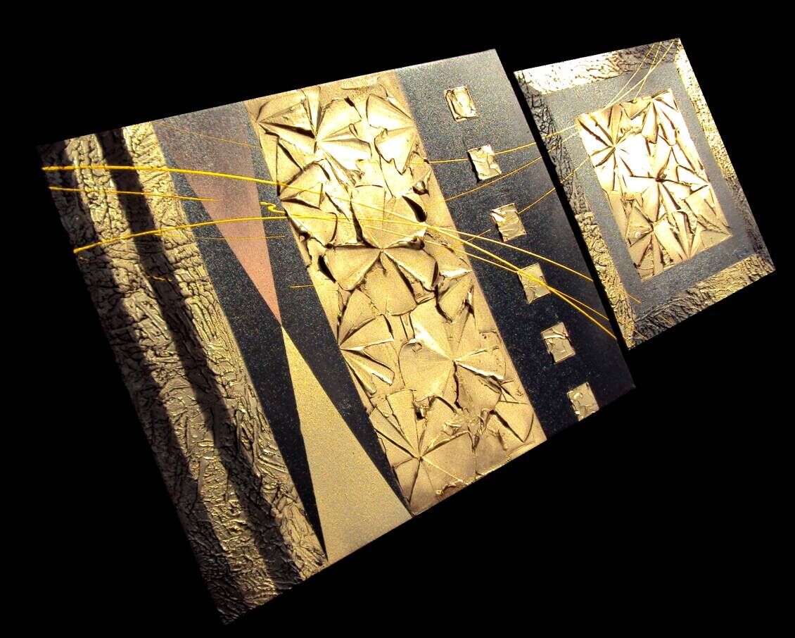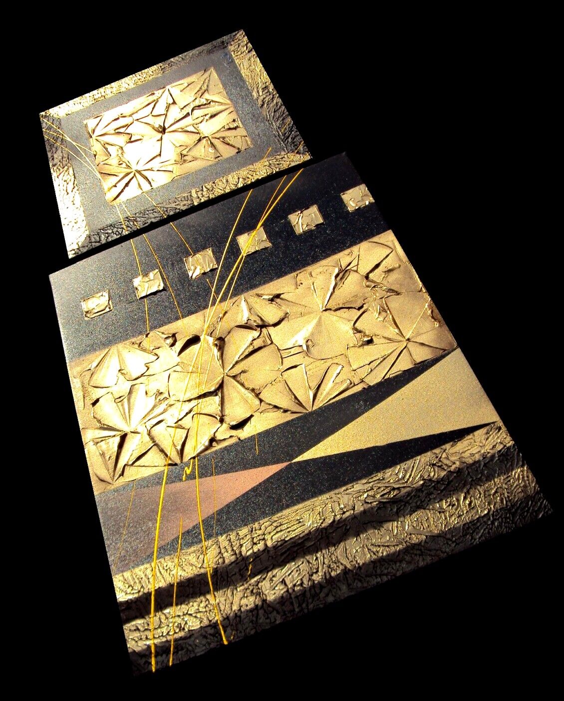 Opera realizzata in tecnica mista tridimensionale polimaterica,mediante l'utilizzo di colori acrilici , olii e metallici , resine epossidiche , paste acriliche,sabbie di fiume . L'opera , e' composta da 1 tela 80 x 60 x 4 cm + 1 tela 50 x 50 x 2 cm . . Il prezzo di vendita e' di 250 ,00 euro+spsp