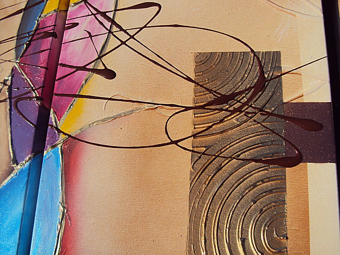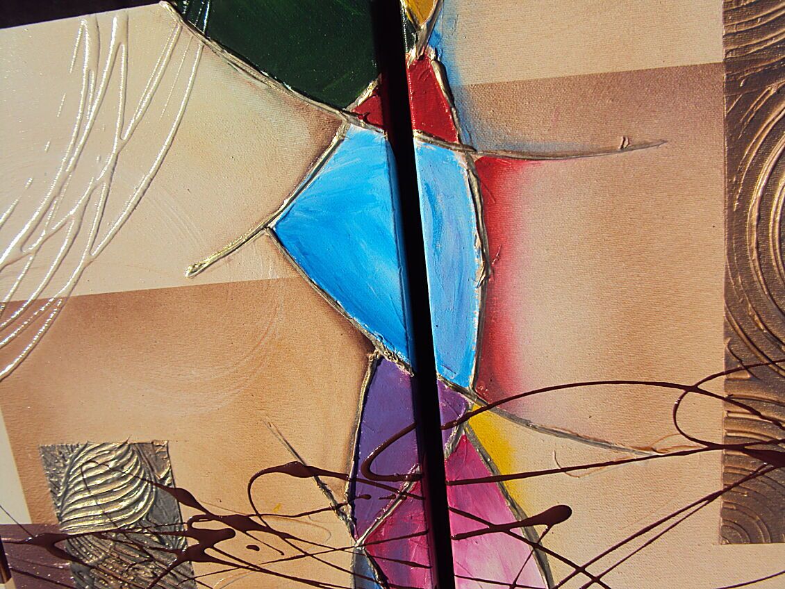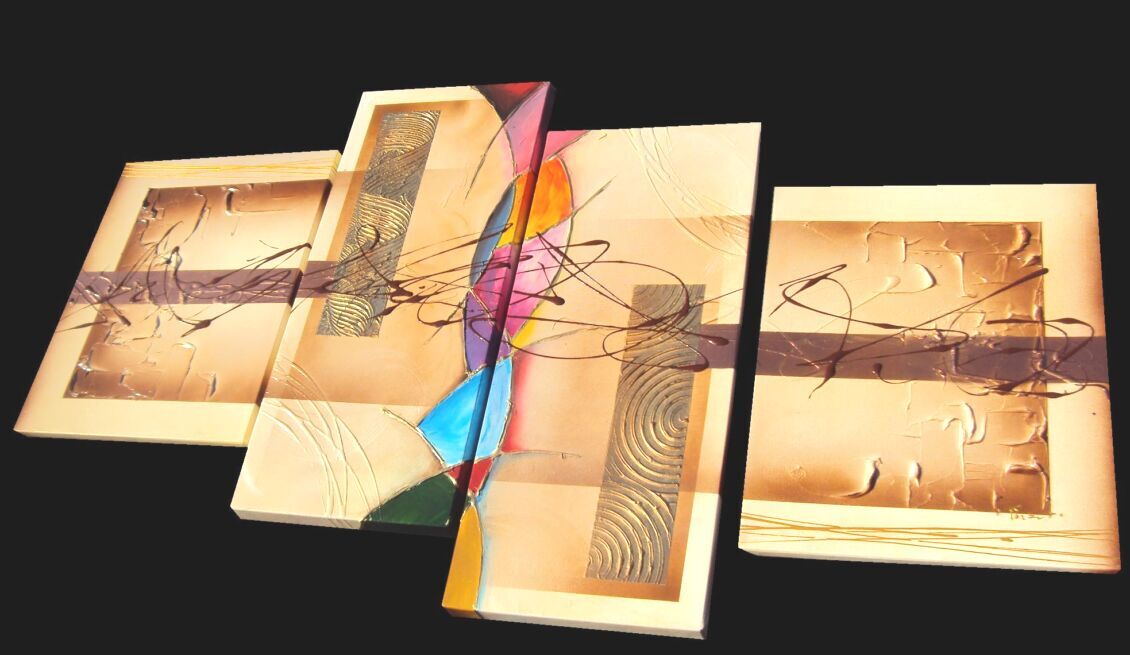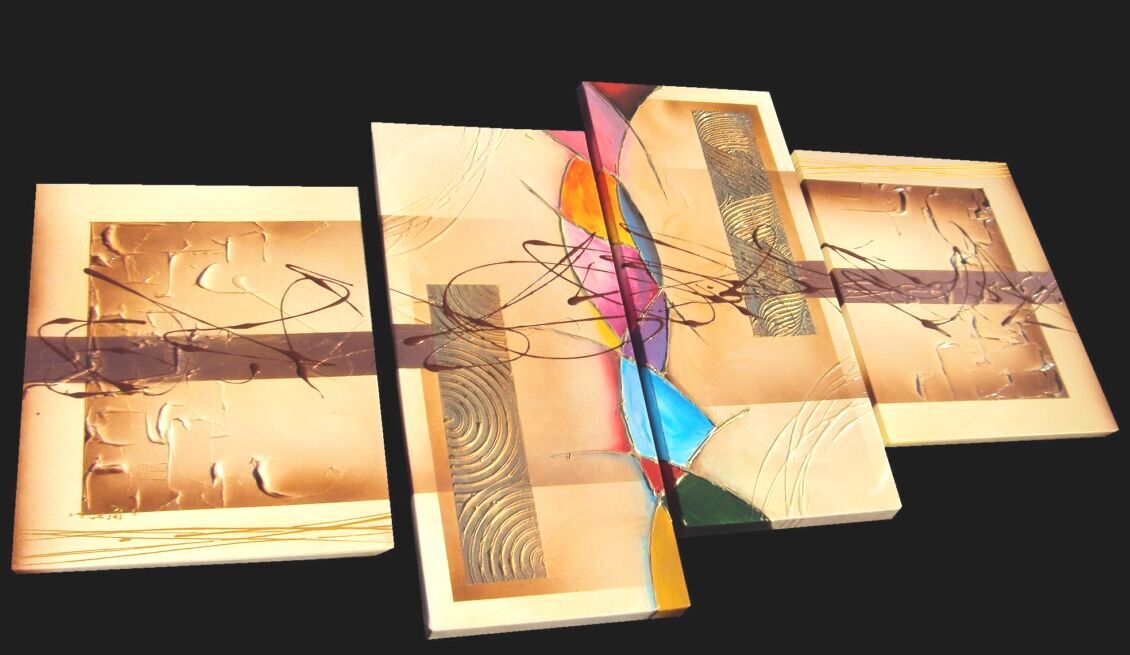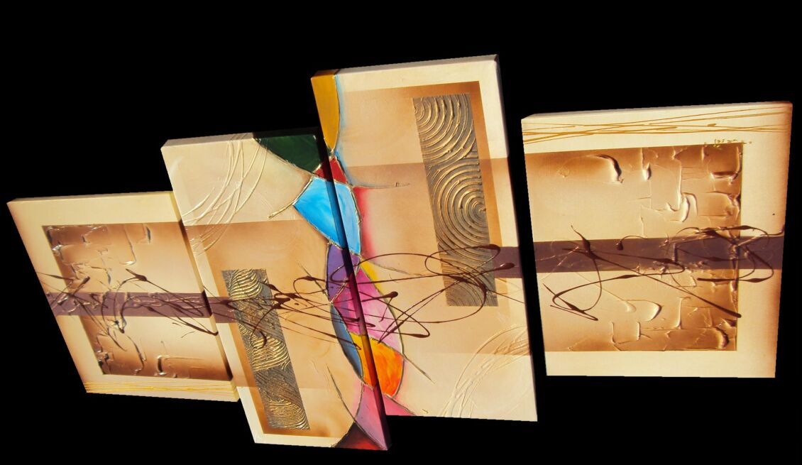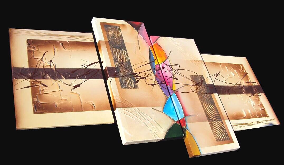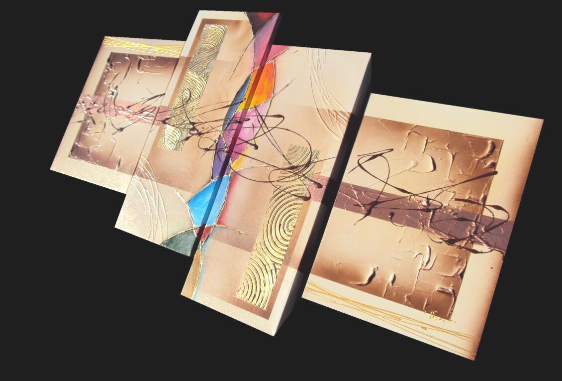 Opera realizzata in tecnica mista ,mediante l'utilizzo di colori acrilici , olii e metallici , paste acriliche, resine, inserti, polveri metalliche preziose . L'opera , e' composta da 2 tele 30 x 70 x 4 + 2 tele cm 40 x 50 x 2 cm cm . Il prezzo di vendita e' di 230 ,00 euro+spsp